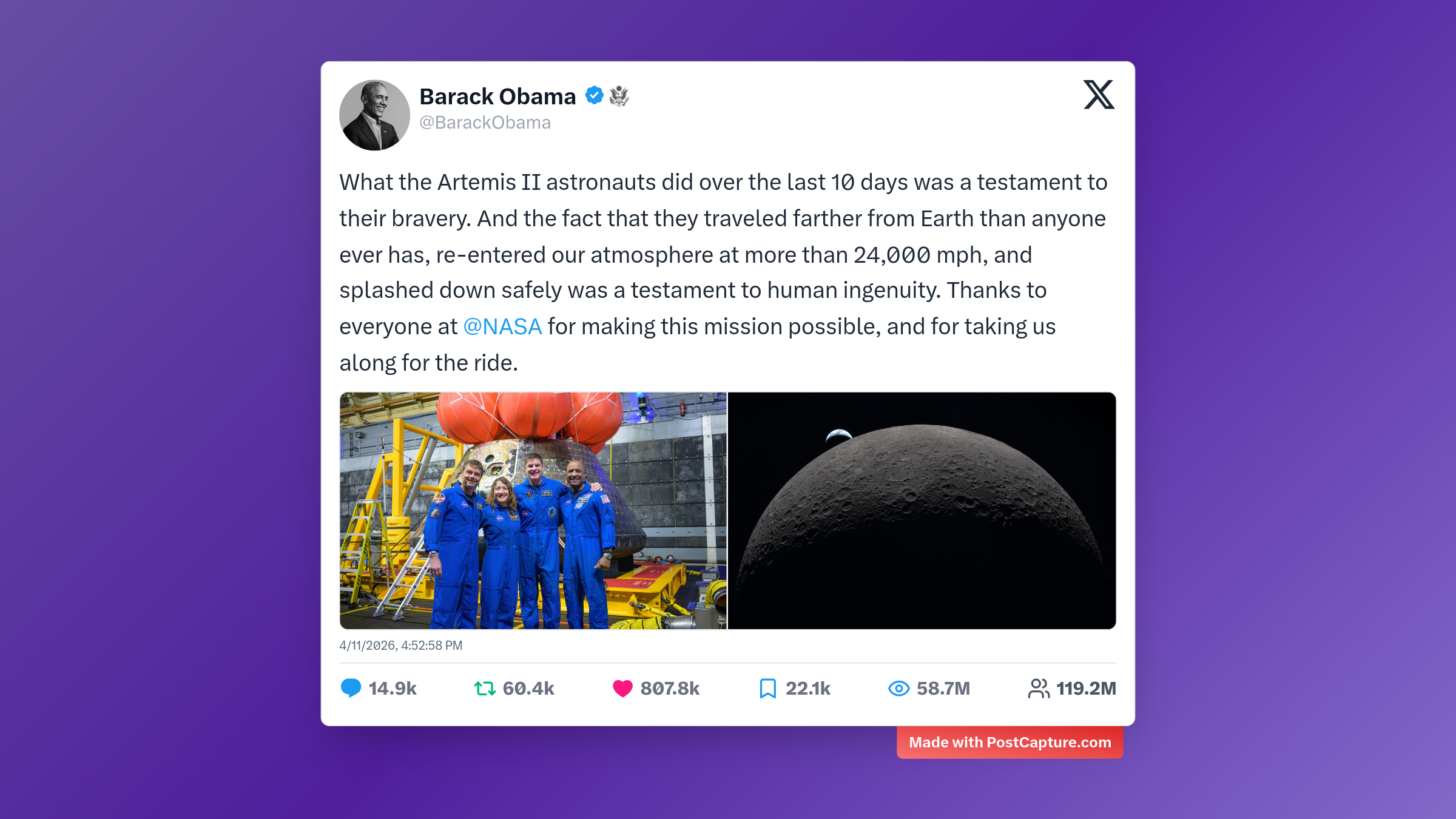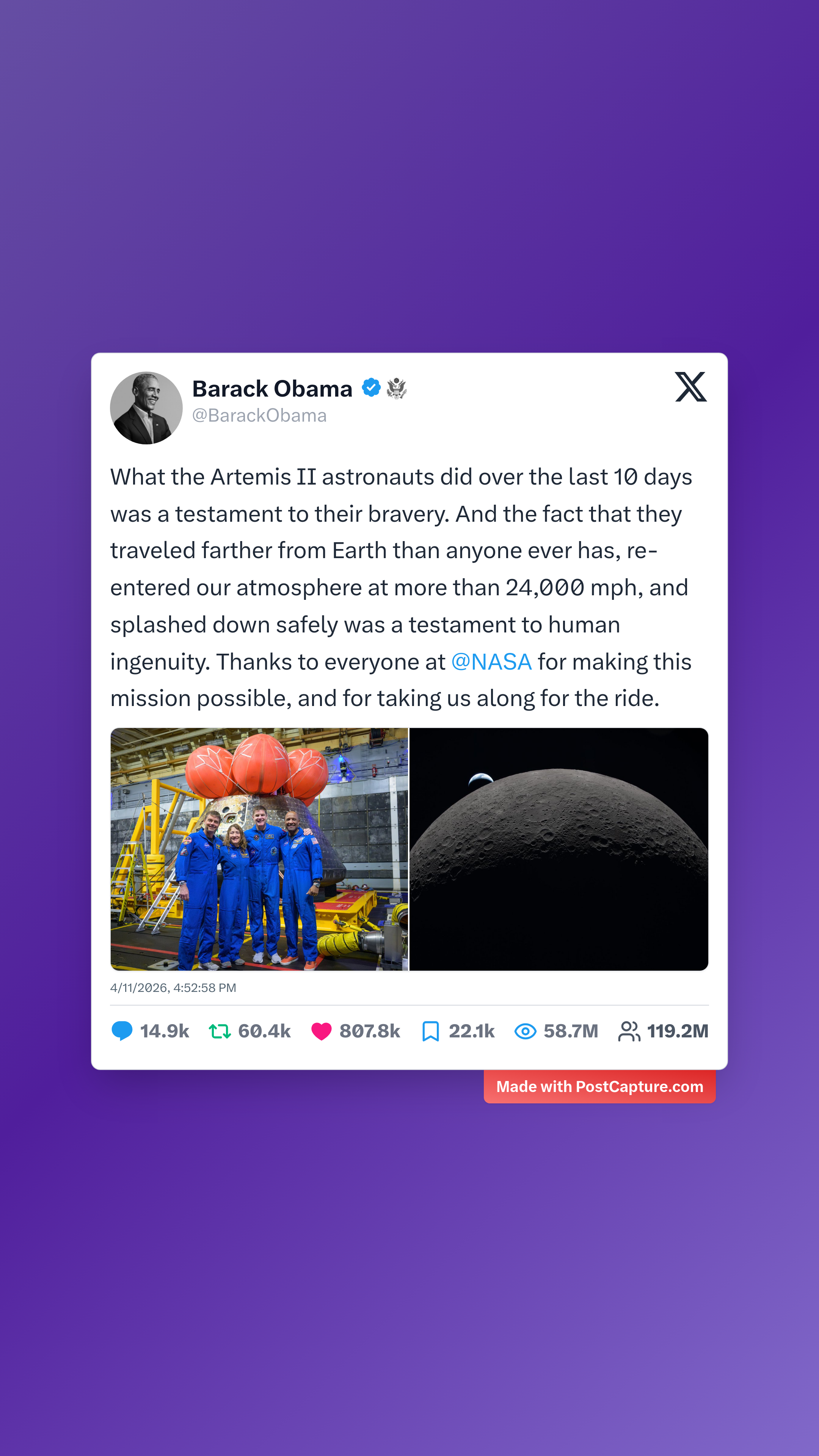 Rounding out the top three, former President Barack Obama took to X to share a touching and reflective message honoring the bravery of the Artemis II astronauts. His post served as a poignant wrap-up to the mission, highlighting not just the courage of the crew but the sheer ingenuity required to bring them home safely. It was a class act of appreciation that struck a chord with his followers, ensuring the mission concluded on a note of pride and unity.