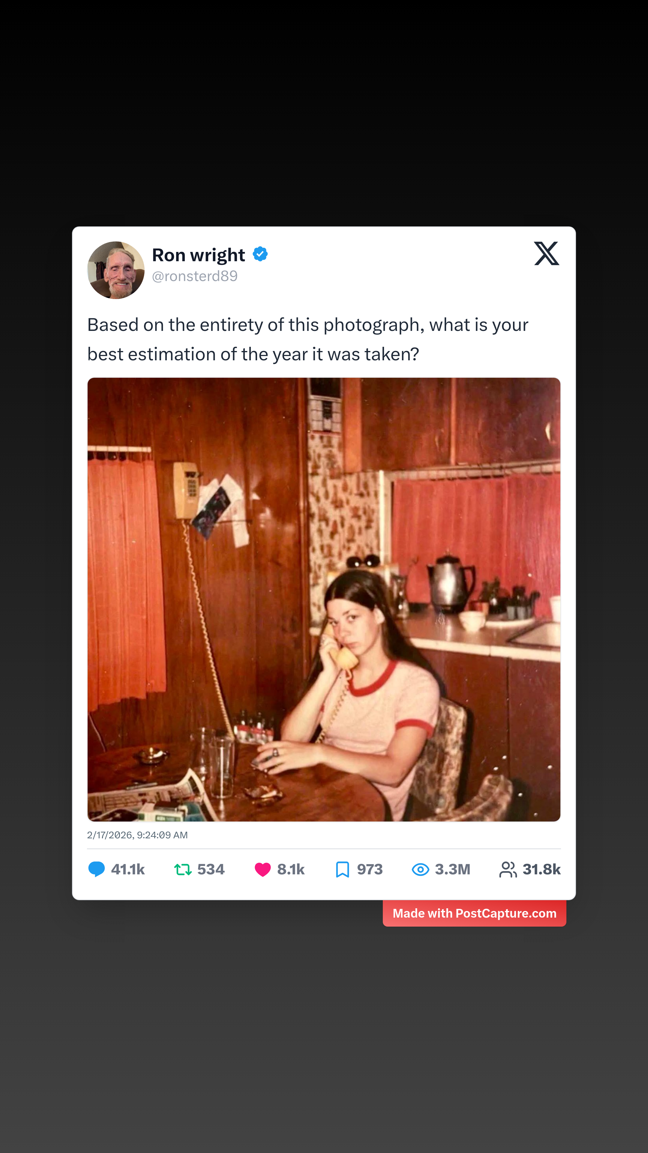 Leading the pack is @ronsterd89's clever challenge: a photo of a woman mid-chat on an old-school rotary phone in a kitschy kitchen, complete with wood panels, a ringer tee, and vintage vibes everywhere. The question? Pinpoint the year based on every detail. It sparked over 41,000 replies, with folks debating everything from hairdos to appliance styles, guessing anywhere from the late '70s to early '80s. Clocking 3.3 million views, this post turned into a communal time-travel adventure, where eagle-eyed users dissected soda cans and wallpaper patterns. It's the perfect blend of nostalgia and sleuthing— who knew a snapshot could launch a thousand theories?