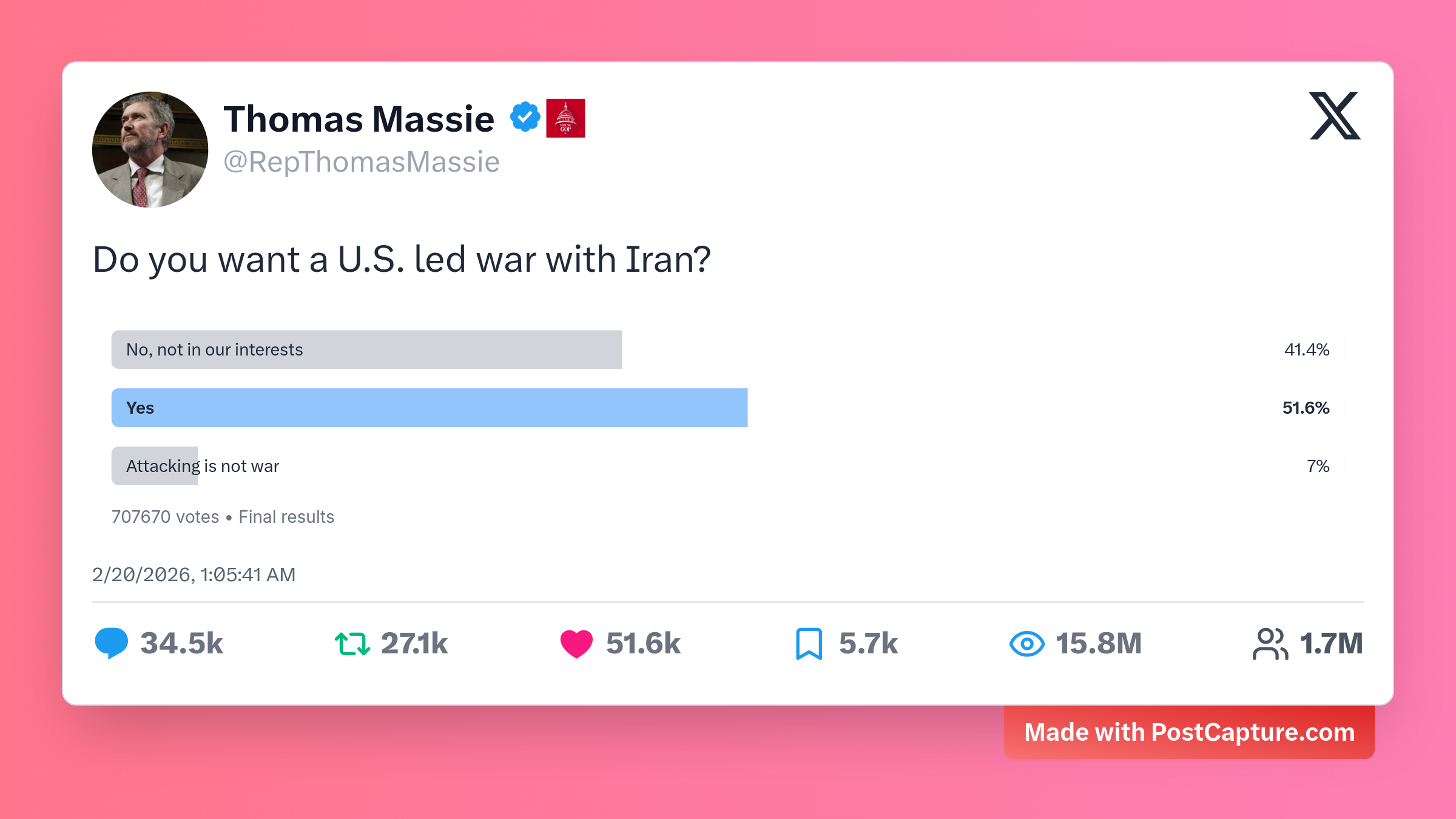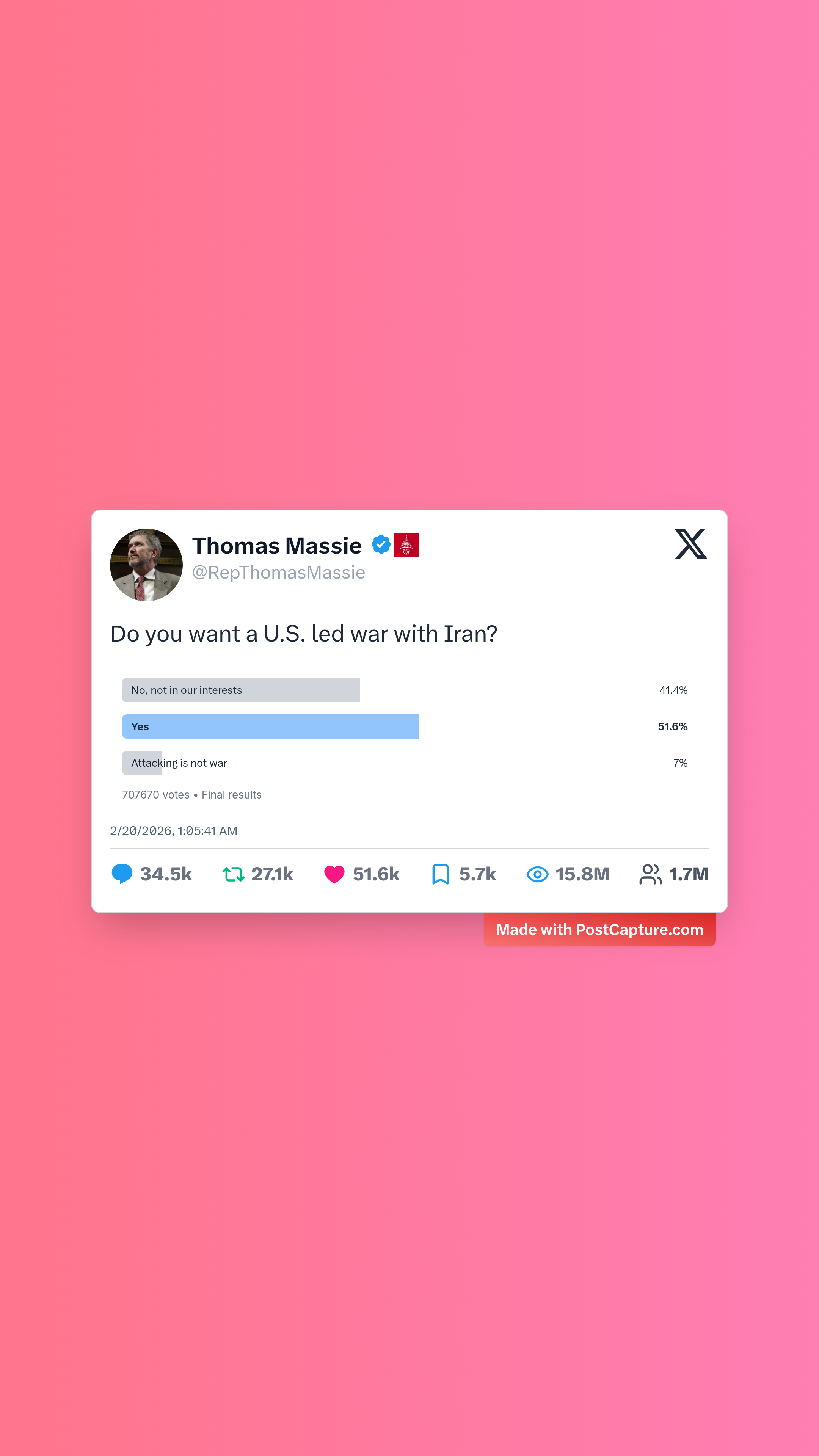 Coming in hot at number two, @RepThomasMassie's provocative poll: 'Do you want a U.S. led war with Iran?' With options like 'No, not in our interests' (41%), 'Yes' (52%), and 'Attacking is not war' (7%), it ignited 34,500 replies and a whopping 15.8 million views. The thread became a virtual debate hall, packed with passionate takes on international relations, moral quandaries, and even some witty one-liners about peace treaties over pizza. Massie's question cut straight to the heart of current events, proving that a simple poll can unleash a torrent of opinions and keep the conversation going for days.