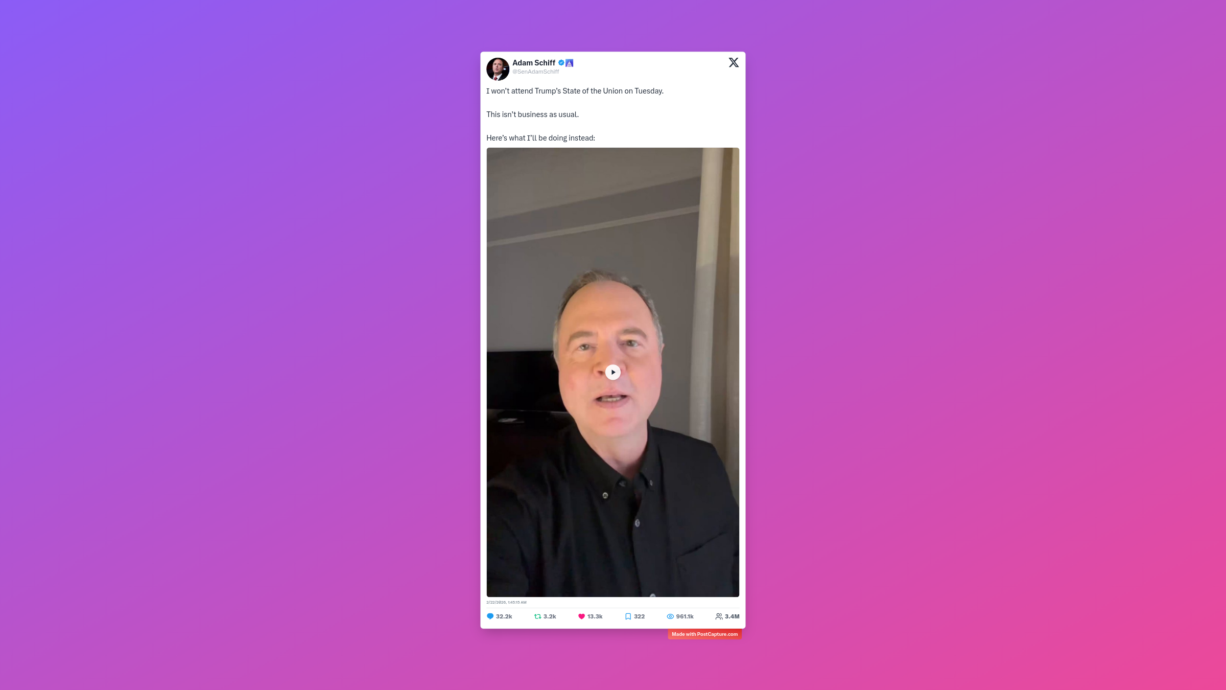 Capping off the trio is @SenAdamSchiff's announcement: 'I won’t attend Trump’s State of the Union on Tuesday. This isn’t business as usual. Here’s what I’ll be doing instead,' linked to a video outlining his alternative agenda. This drew 32,200 replies and nearly a million views, splitting commenters into camps of applause for his principled stand and eye-rolls at what some called theatrical protest. The video adds depth, showing community-focused activities, turning a boycott into a statement on priorities. In today's polarized climate, it's a spark that lit up discussions on duty, dissent, and the drama of democracy.