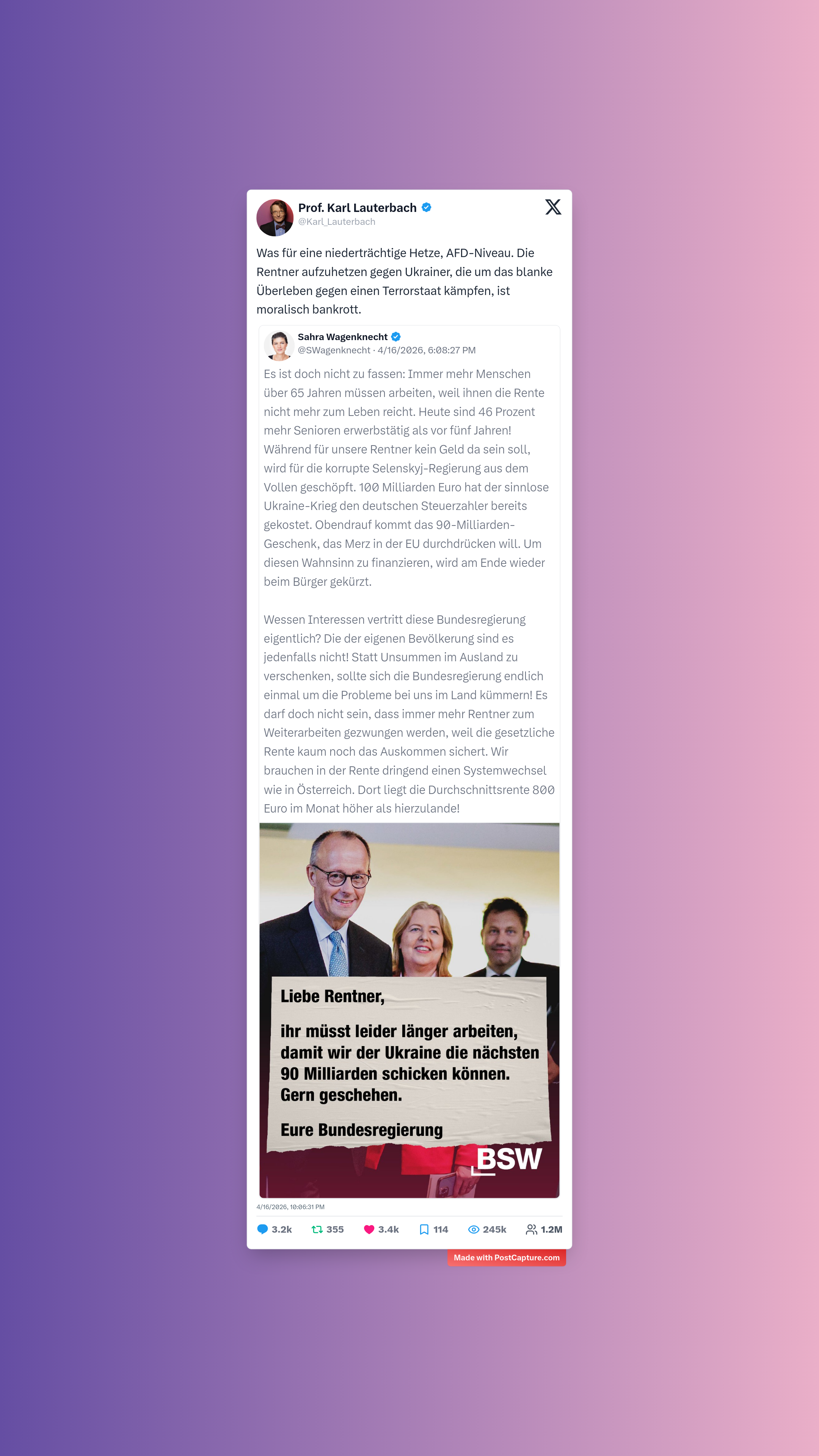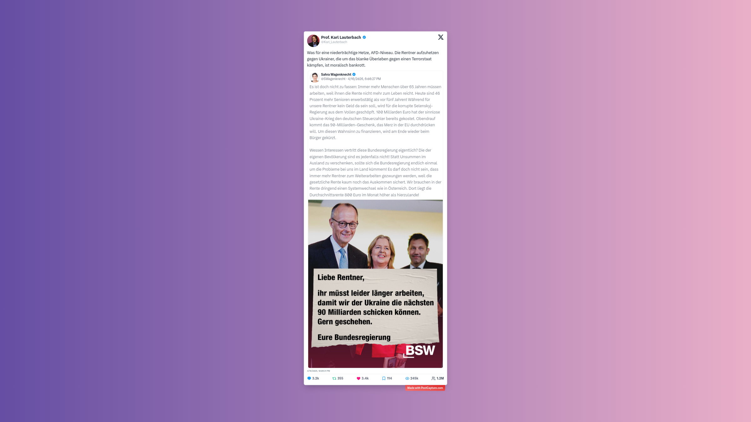 Was für eine niederträchtige Hetze, AFD-Niveau. Die Rentner aufzuhetzen gegen Ukrainer, die um das blanke Überleben gegen einen Terrorstaat kämpfen, ist moralisch bankrott.