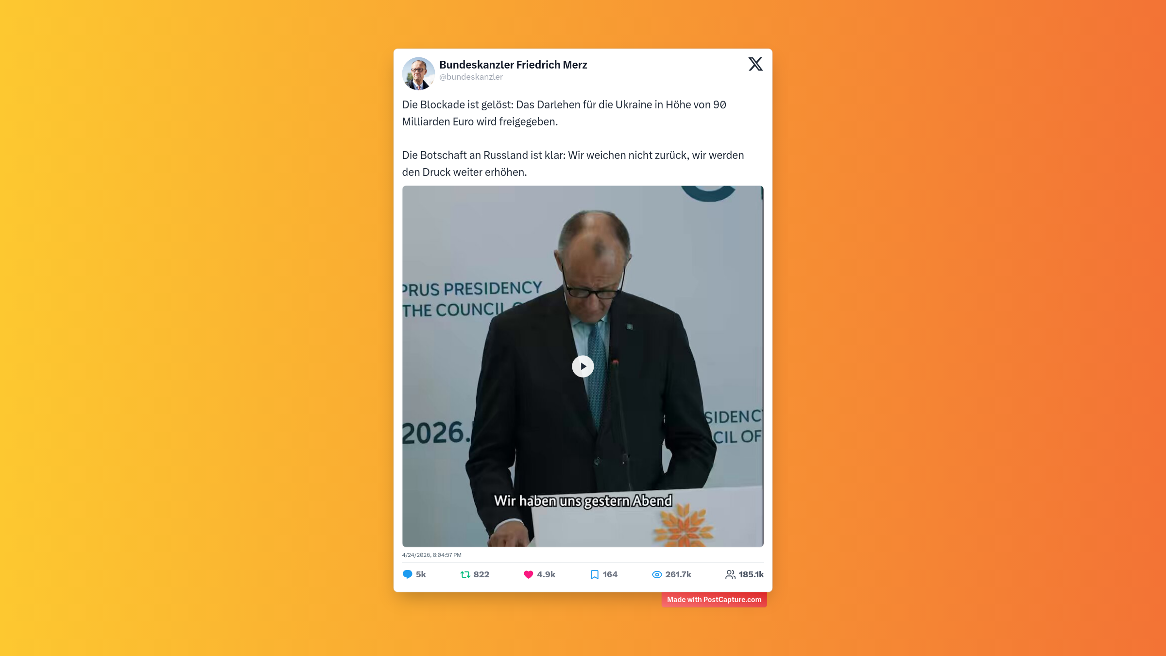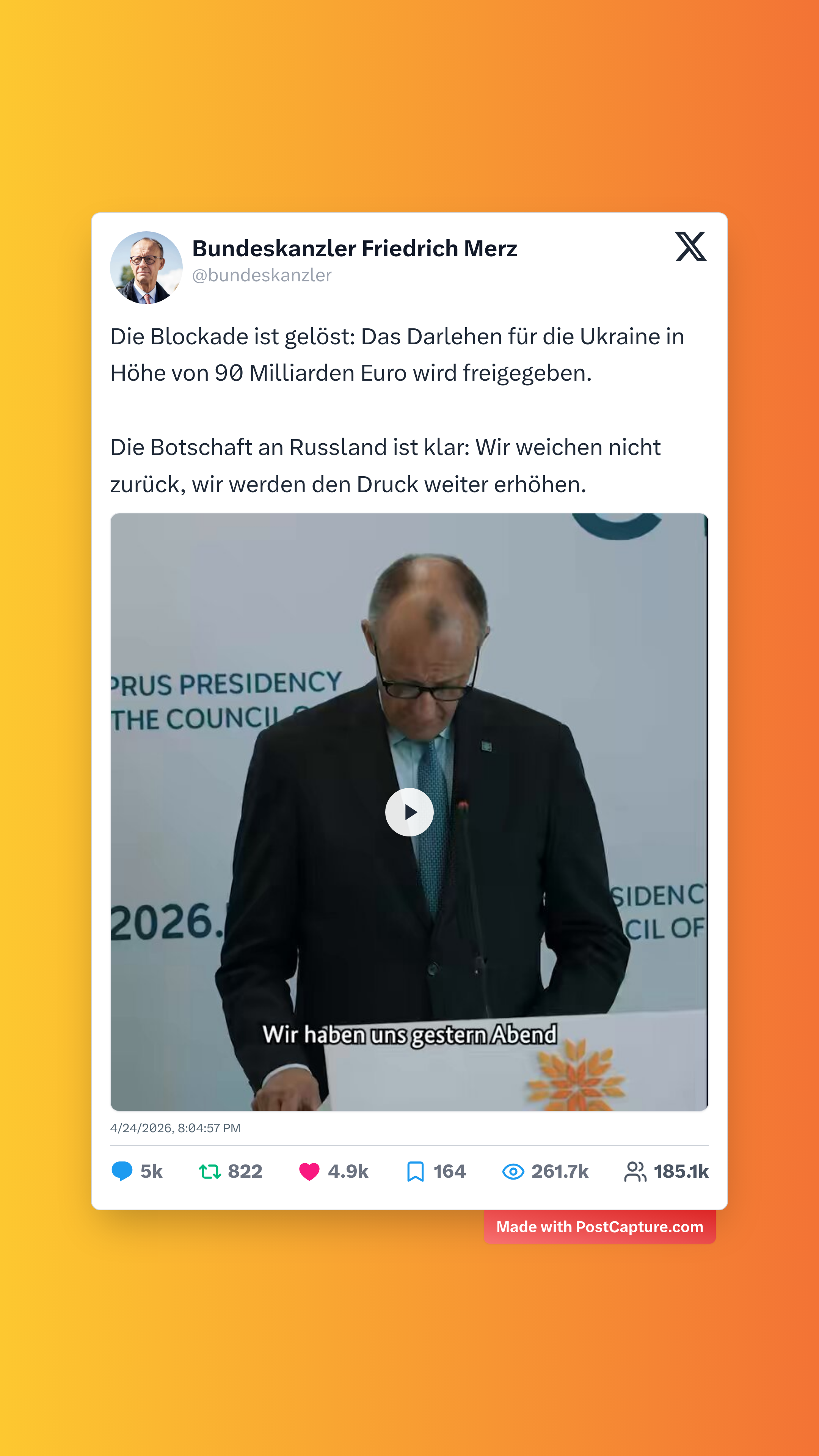 Die Blockade ist gelöst: Das Darlehen für die Ukraine in Höhe von 90 Milliarden Euro wird freigegeben. Die Botschaft an Russland ist klar: Wir weichen nicht zurück, wir werden den Druck weiter erhöhen.