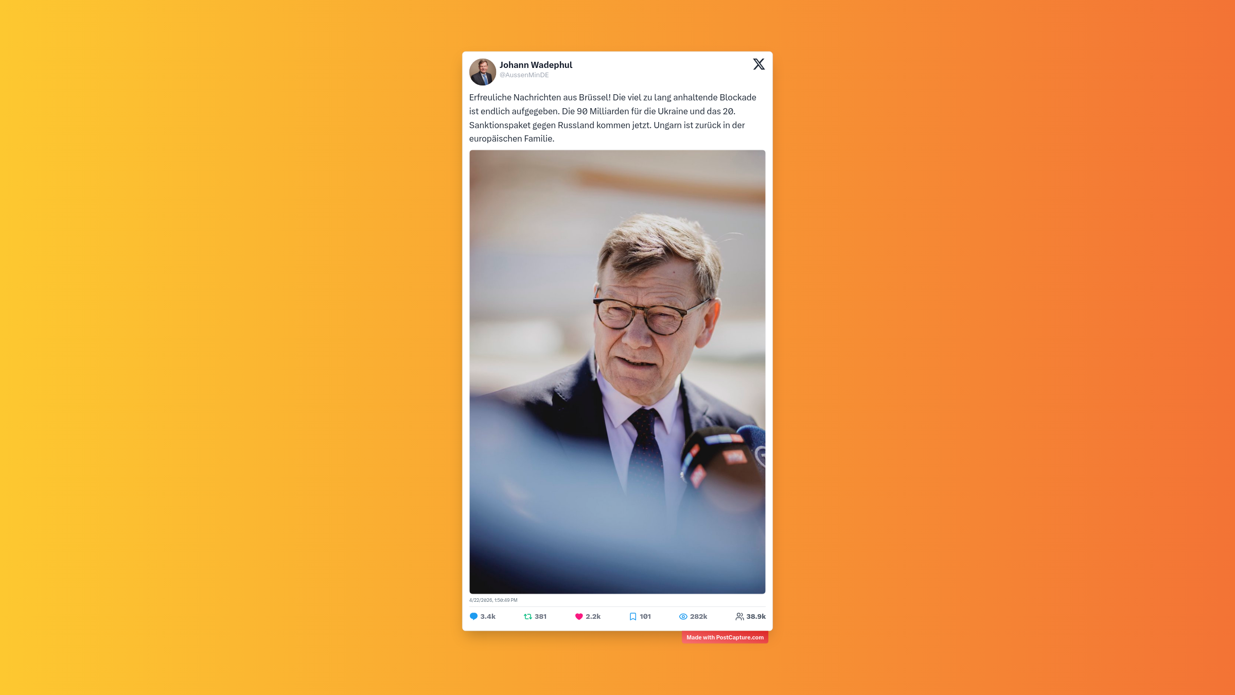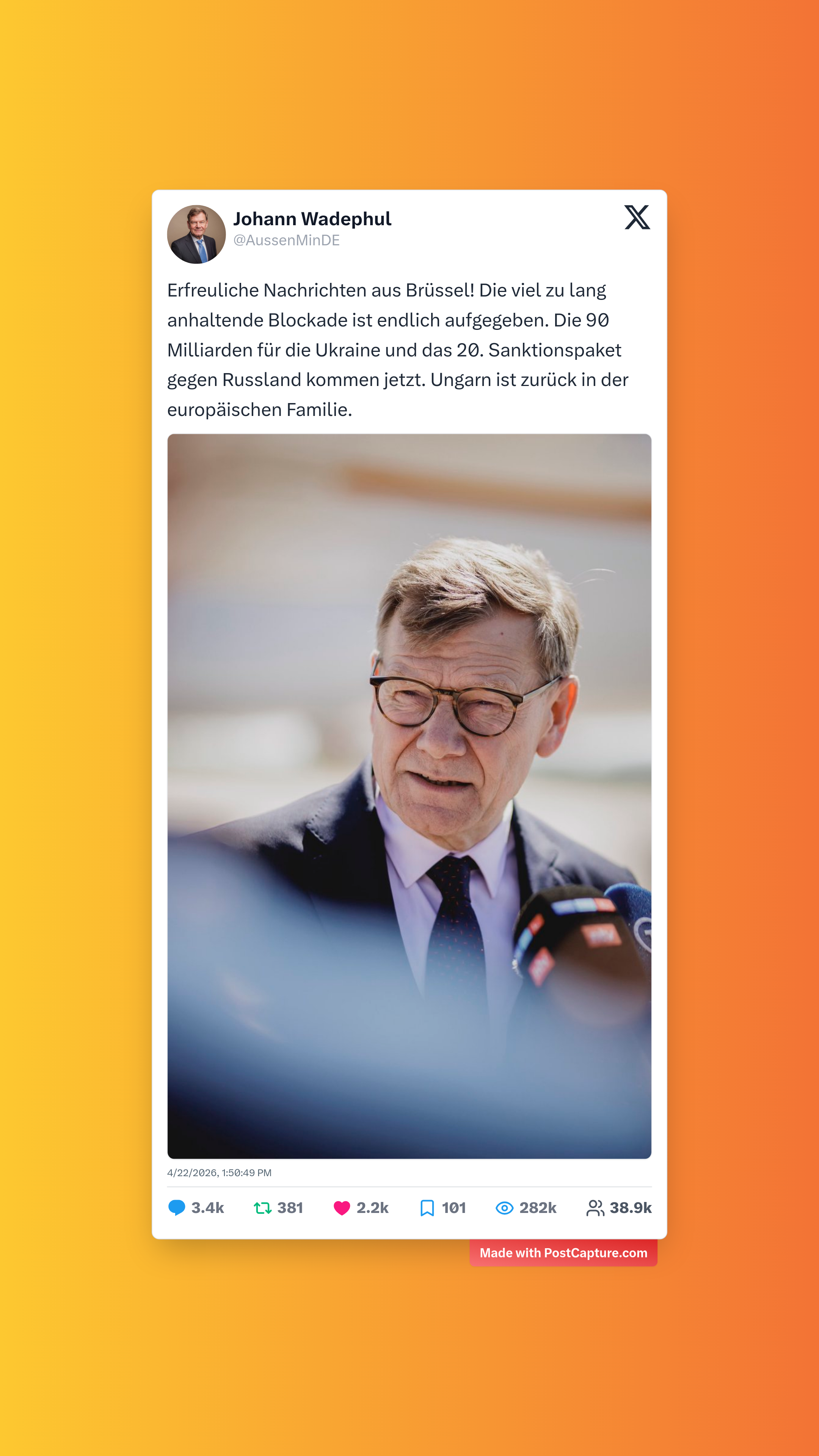 Erfreuliche Nachrichten aus Brüssel! Die viel zu lang anhaltende Blockade ist endlich aufgegeben. Die 90 Milliarden für die Ukraine und das 20. Sanktionspaket gegen Russland kommen jetzt. Ungarn ist zurück in der europäischen Familie.