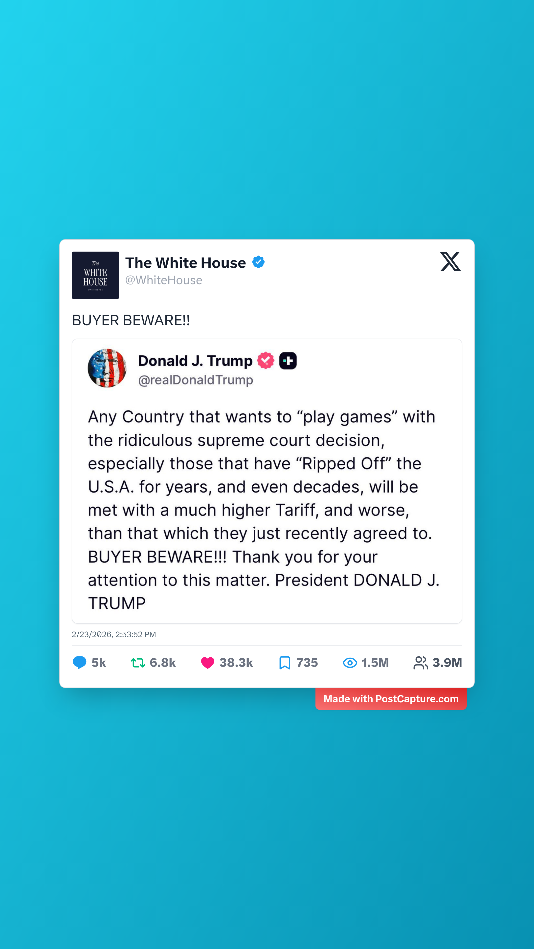 An der Spitze steht das @WhiteHouse mit einem dramatischen "BUYER BEWARE!!". Das Bild warnt wahrscheinlich vor einem Kauf oder einer Entscheidung, und es hat satte 5.000 Replies und 1,5 Millionen Views ausgelöst. Die Kommentare reichen von Unterstützung über Spott bis hin zu Verschwörungstheorien – es fühlt sich an wie ein Weckruf aus dem Weißen Haus, der die halbe Welt zum Tippen bringt. In Zeiten von Fake News und schnellen Urteilen ist das der perfekte Katalysator für Diskussionen. Wer hätte gedacht, dass eine Warnung so viral gehen kann? Fast wie ein Black-Friday-Deal, der schiefgeht.