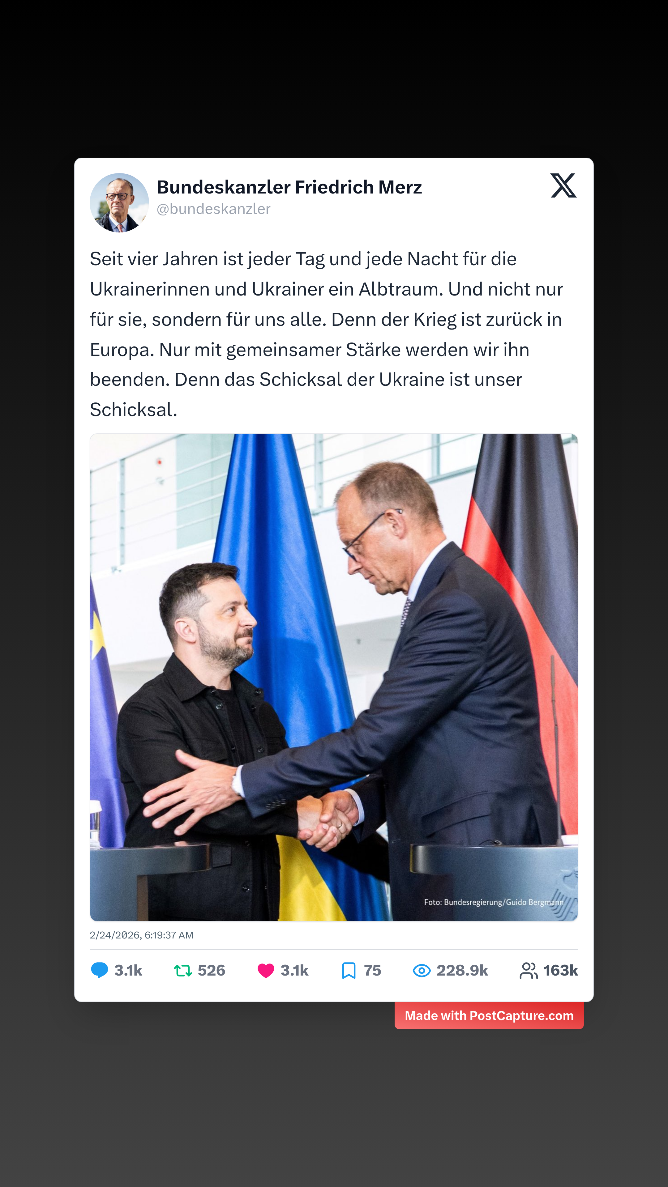 Seit vier Jahren ist jeder Tag und jede Nacht für die Ukrainerinnen und Ukrainer ein Albtraum. Und nicht nur für sie, sondern für uns alle. Denn der Krieg ist zurück in Europa. Nur mit gemeinsamer Stärke werden wir ihn beenden. Denn das Schicksal der Ukraine ist unser Schicksal.