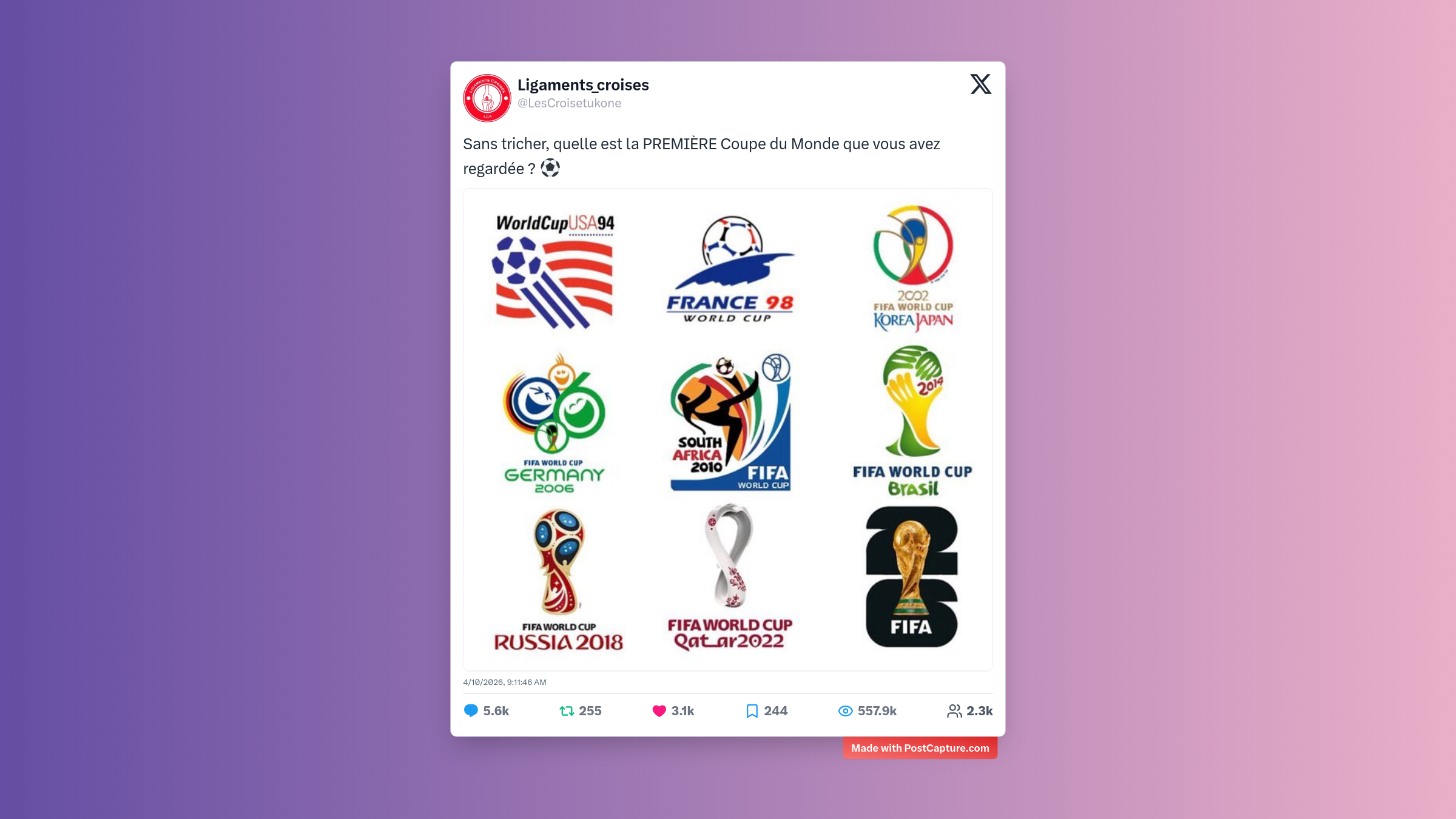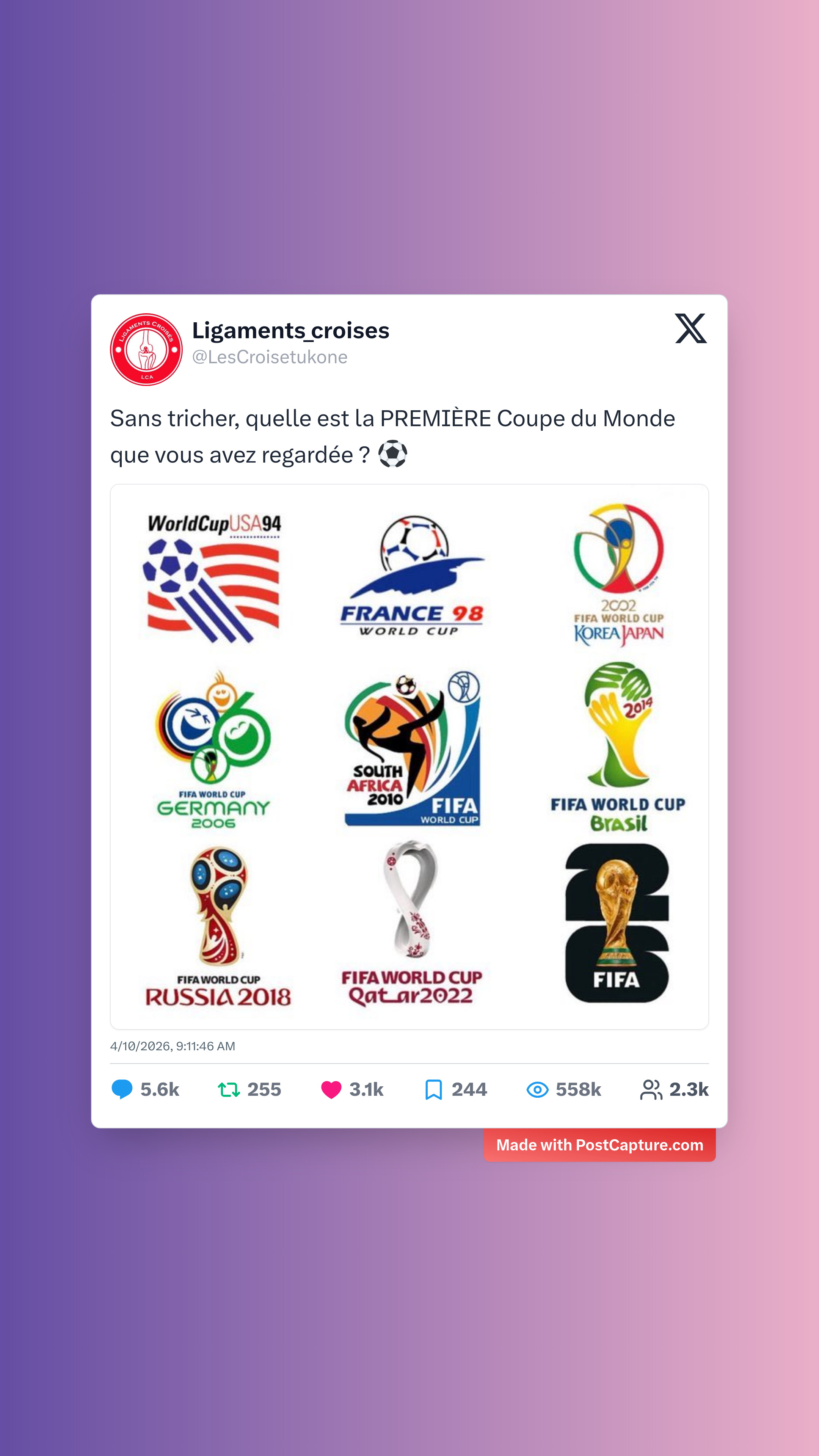 Pour finir sur une note plus légère, Ligaments_croises a fait appel à la fibre nostalgique de ses abonnés en demandant quelle était la première Coupe du Monde qu’ils avaient suivie. Avec plus de 5,500 réponses, le post a transformé l’espace commentaire en un véritable carnet de souvenirs sportifs, où chacun a pu fièrement arborer ses années de supporter.