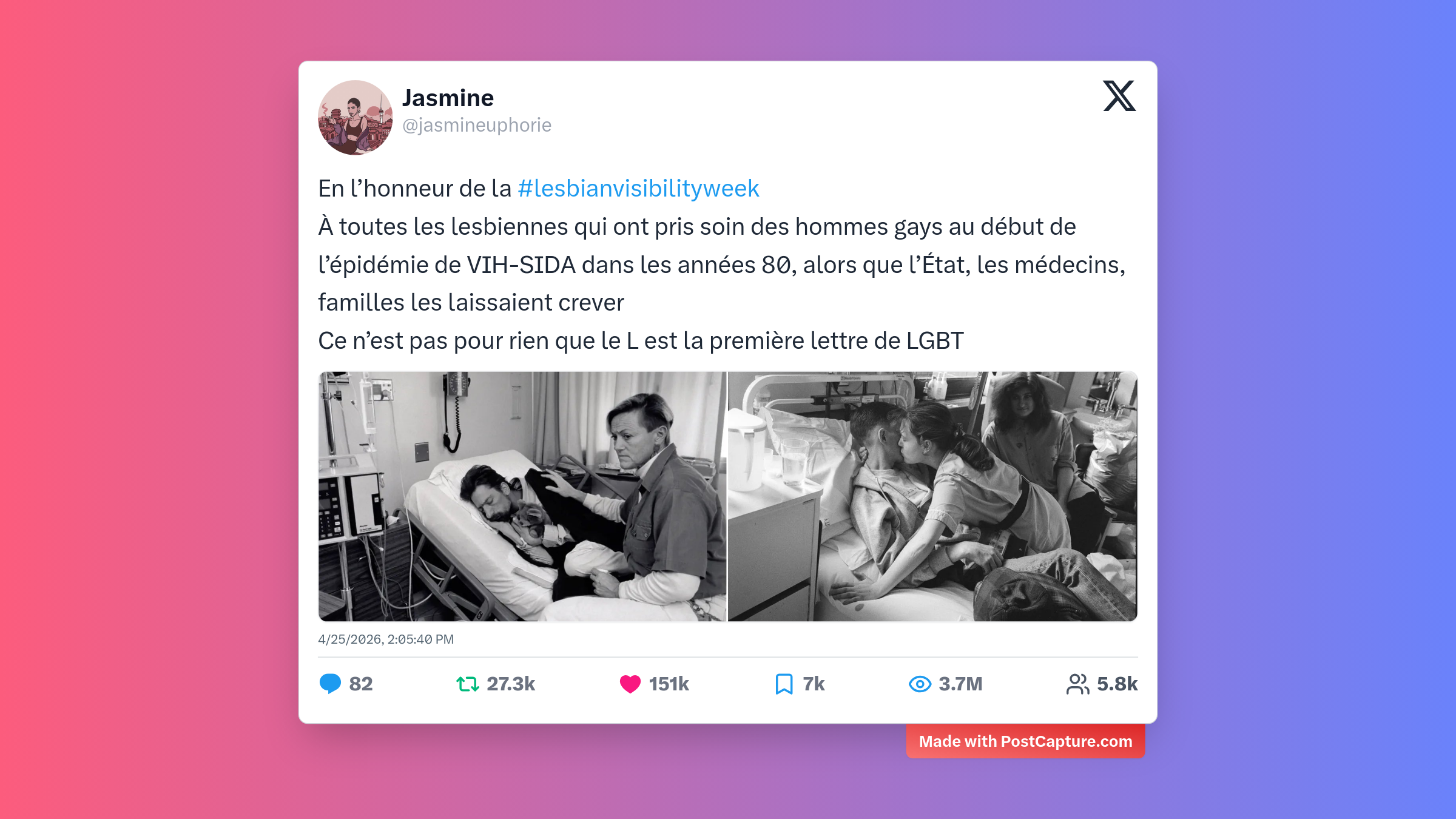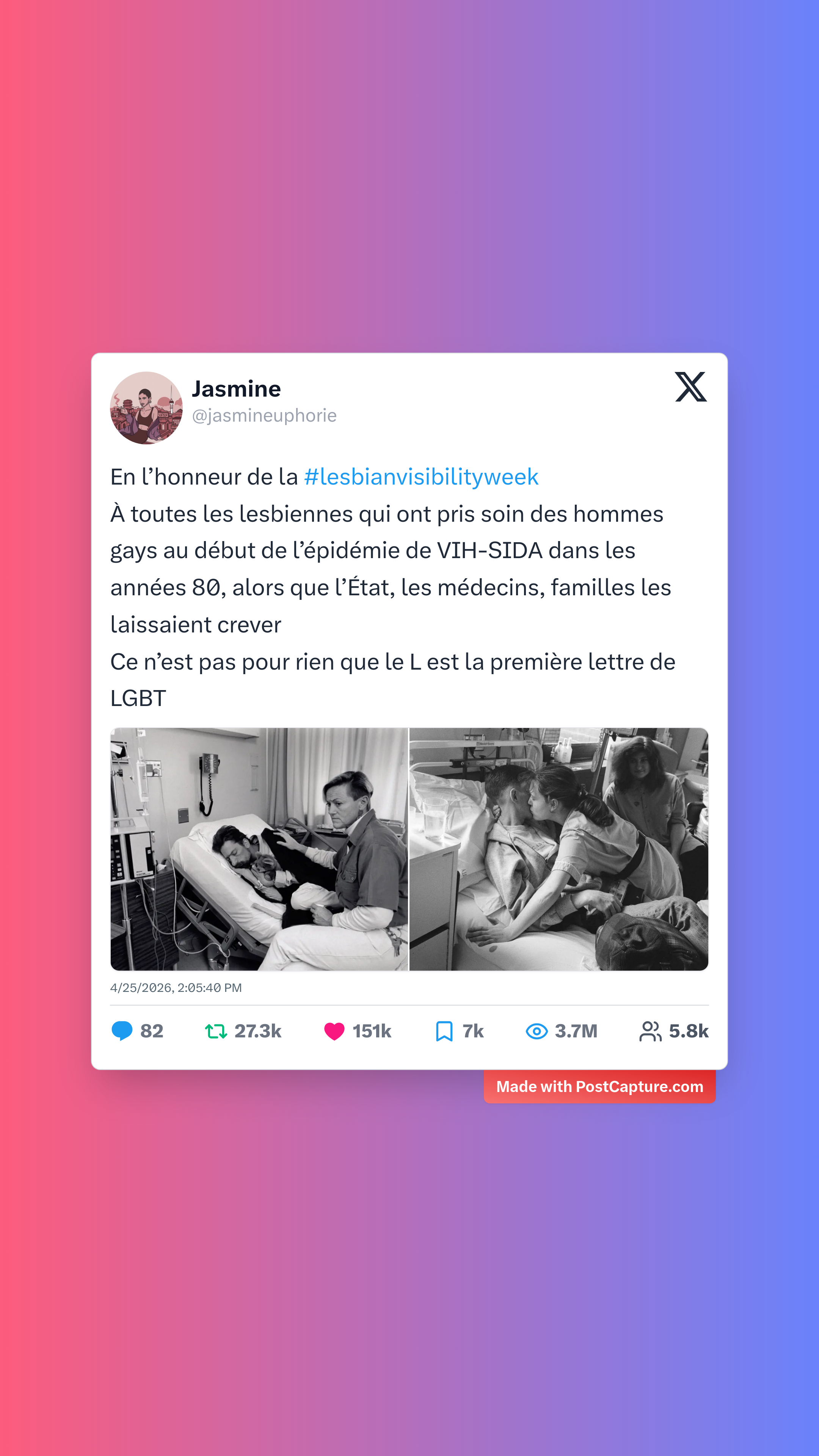 À l'occasion de la #lesbianvisibilityweek, Jasmine a partagé un hommage poignant aux lesbiennes ayant soutenu la communauté gay durant les années 80. Un rappel historique nécessaire qui a profondément touché les utilisateurs, rappelant l'importance de la solidarité au sein de la communauté LGBTQ+ dès ses premières luttes.