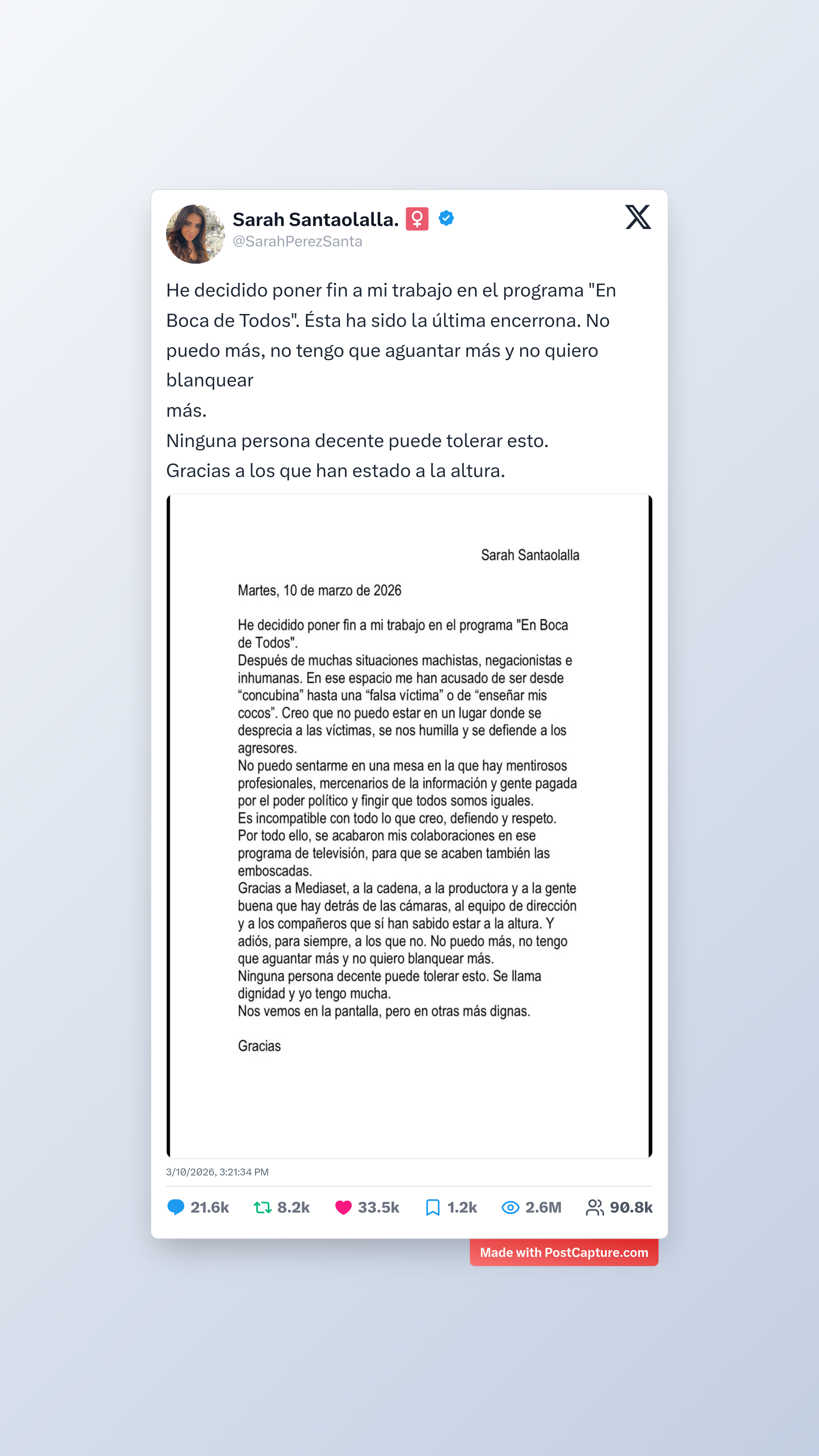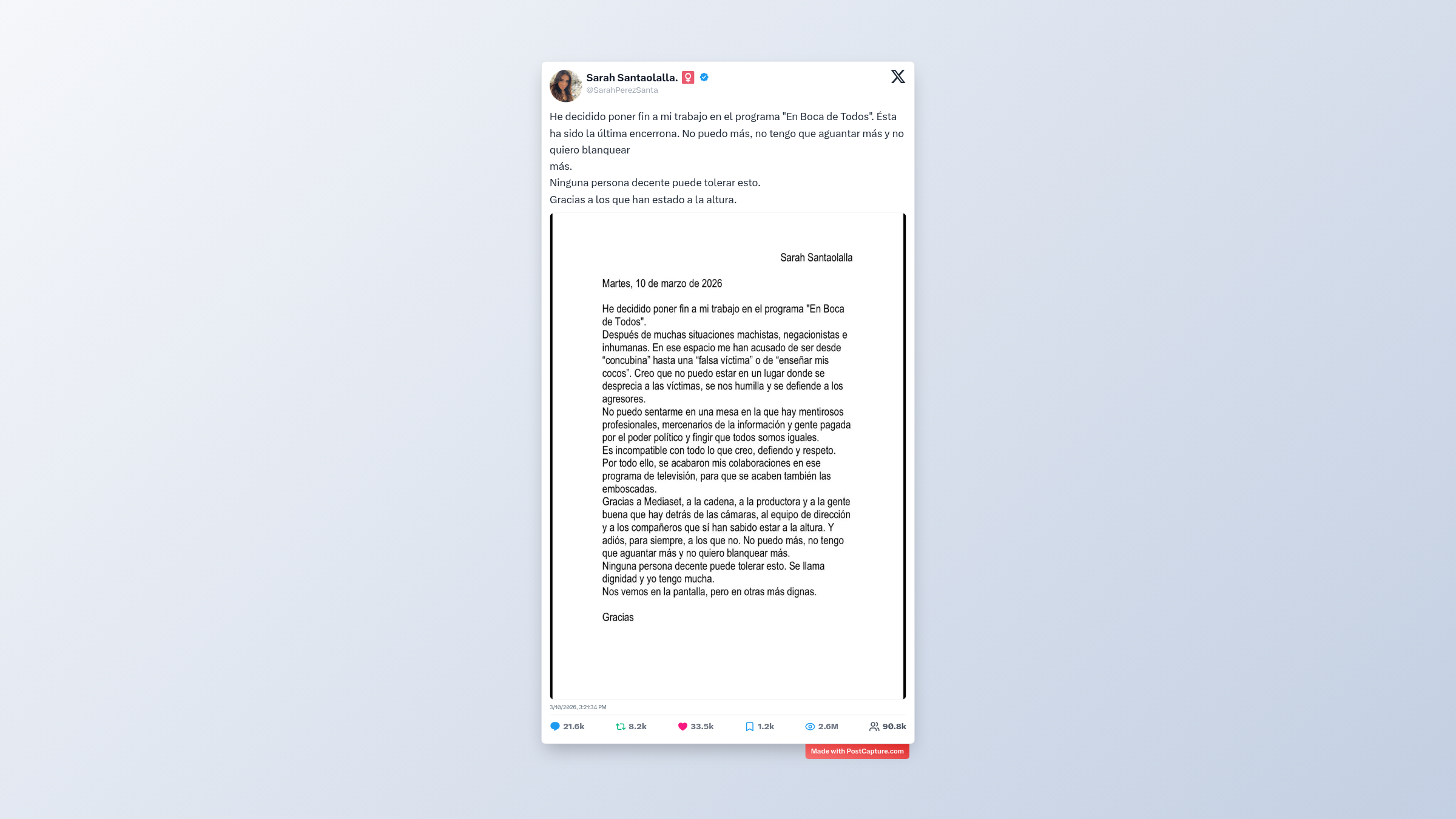 La analista política Sarah Santaolalla (@SarahPerezSanta) publicó un tweet acompañado de una carta formal en la que anunciaba su salida definitiva del programa de Mediaset "En Boca de Todos". Sin rodeos y con una carta que no dejaba lugar a la interpretación, explicó que había sido víctima de un ambiente sexista y denigrante, donde la acusaron de ser una "concubina", una "falsa víctima" y de "presumir". Su mensaje fue directo: ninguna persona con dignidad tendría que aguantar eso. El resultado fue un aluvión de 21.600 respuestas, entre apoyo masivo, debate sobre la televisión basura y más de un comentario afilado hacia el propio programa. Una de esas veces en que las redes sociales funcionan como caja de resonancia de lo que pasa, y lo que pasa no es bonito.