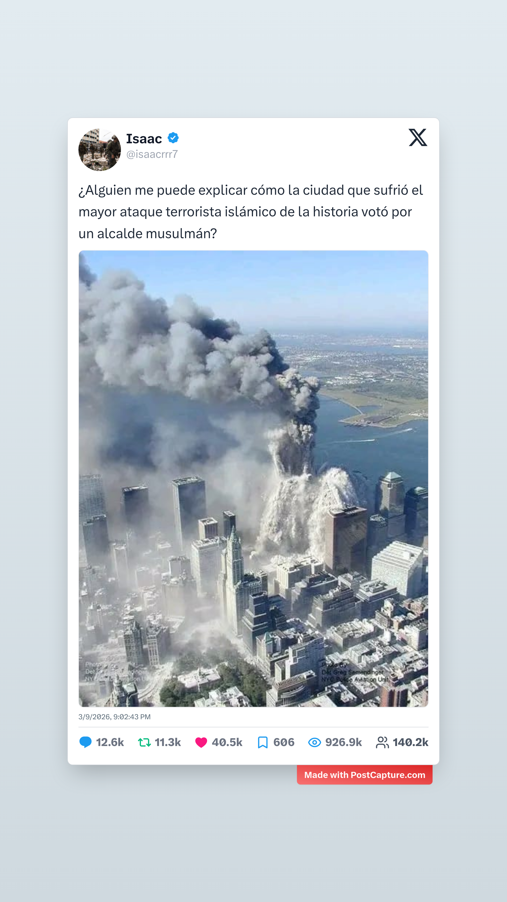 Isaac (@isaacrrr7), judío argentino afincado en Israel, retomó una pregunta que lleva años circulando en ciertos sectores de la derecha y que esta semana volvió a explotar: cómo puede ser que Londres, la ciudad que sufrió el mayor ataque terrorista islámico de la historia, haya votado a un alcalde musulmán. El tweet fue acompañado de una icónica fotografía del derrumbe de las Torres Gemelas, atribuida a la Unidad de Aviación de la NYPD. Con 12.600 respuestas y más de 40.000 likes, el post generó un debate encendido entre quienes lo consideran una reflexión legítima y quienes lo ven como una falacia de manual. En X, como en la vida, las preguntas retóricas rara vez son solo preguntas.
