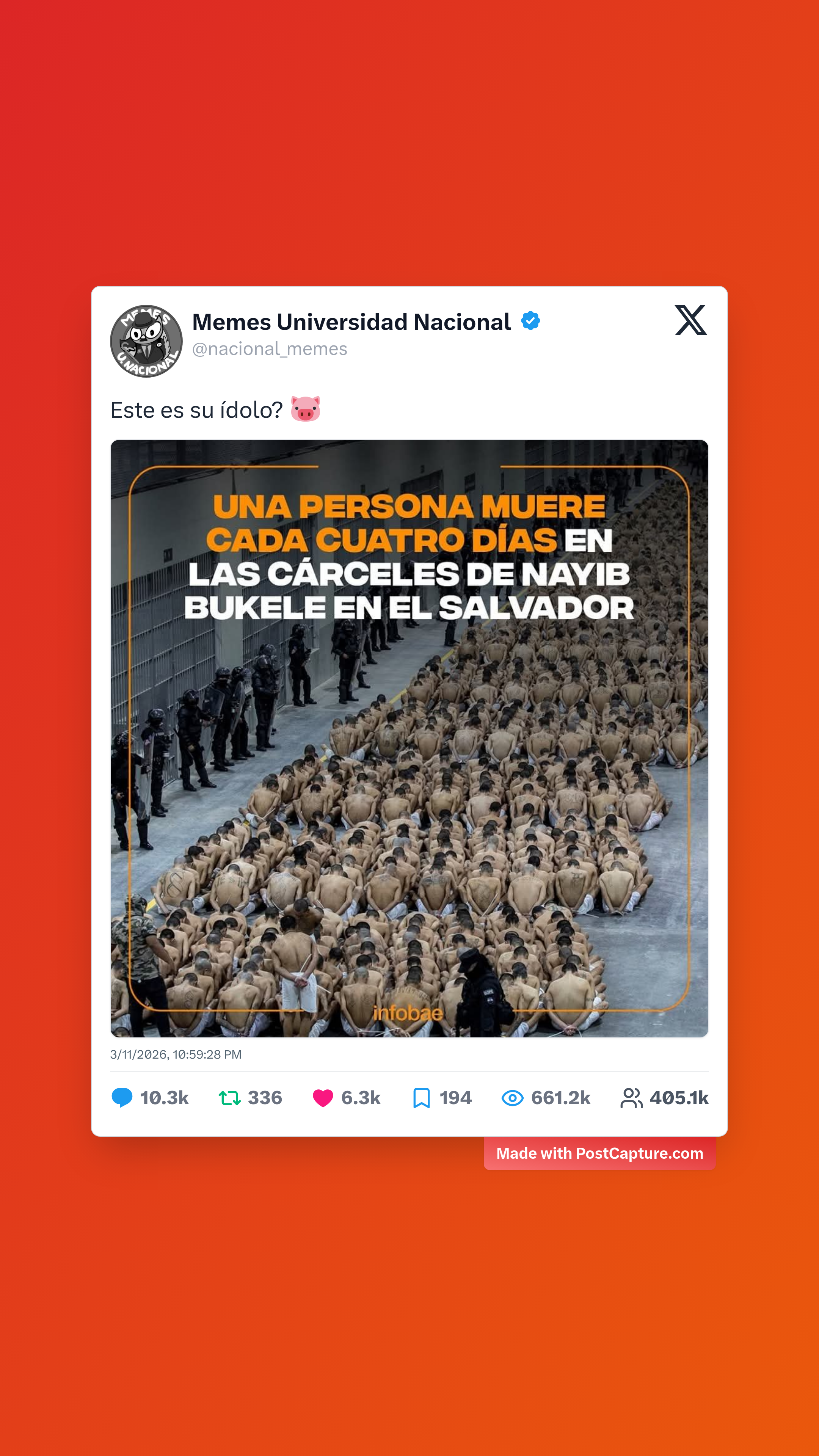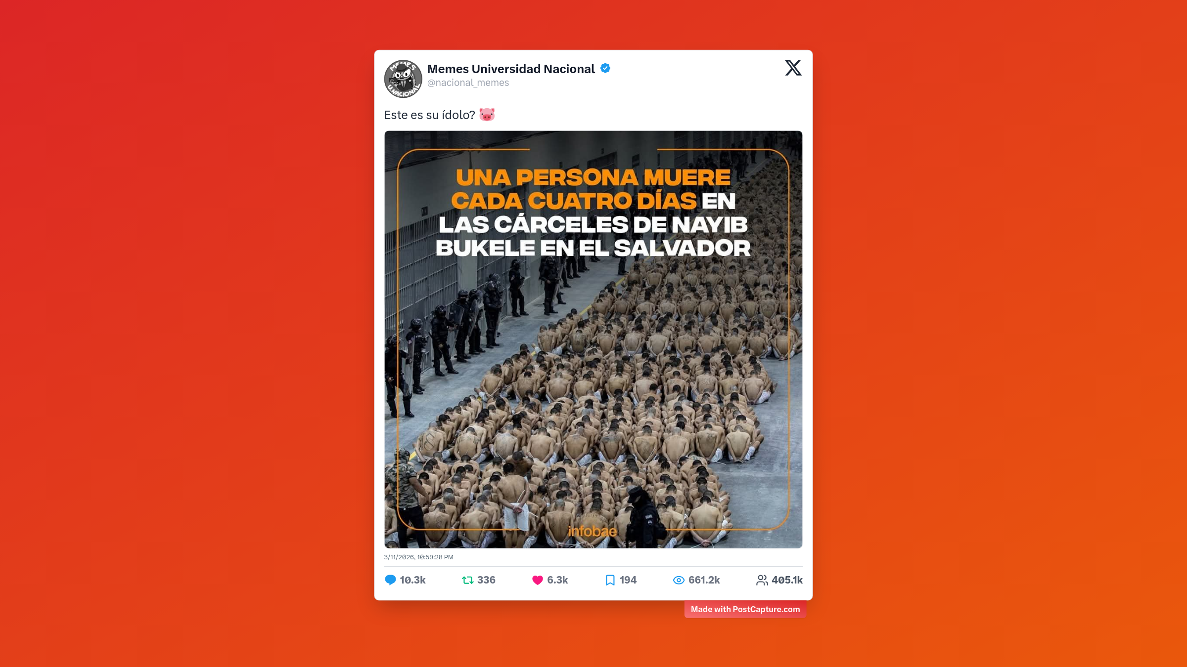La cuenta @nacional_memes, con sus más de 405.000 seguidores, publicó una imagen acompañada de un simple "¿Este es su ídolo? 🐷". La imagen mostraba presos hacinados en una instalación carcelaria de El Salvador con el texto superpuesto: "Una persona muere cada cuatro días en las cárceles de Nayib Bukele". Con 10.300 respuestas y más de 660.000 vistas, el post dividió a los usuarios entre defensores del modelo de mano dura y quienes denuncian las condiciones inhumanas de detención. Una cuenta conocida por sus memes universitarios que esta vez optó por algo más incómodo y, precisamente por eso, mucho más viral.
