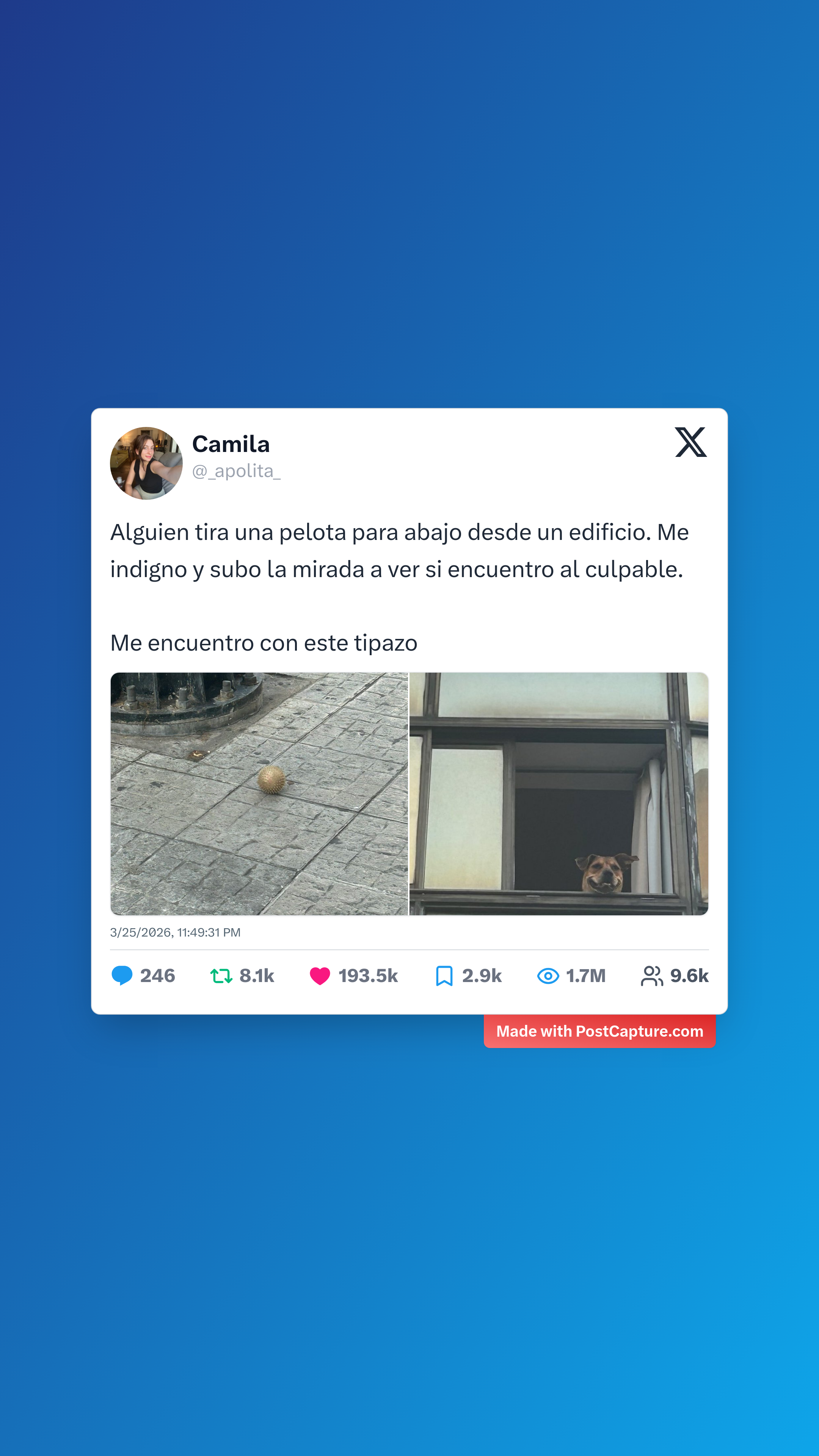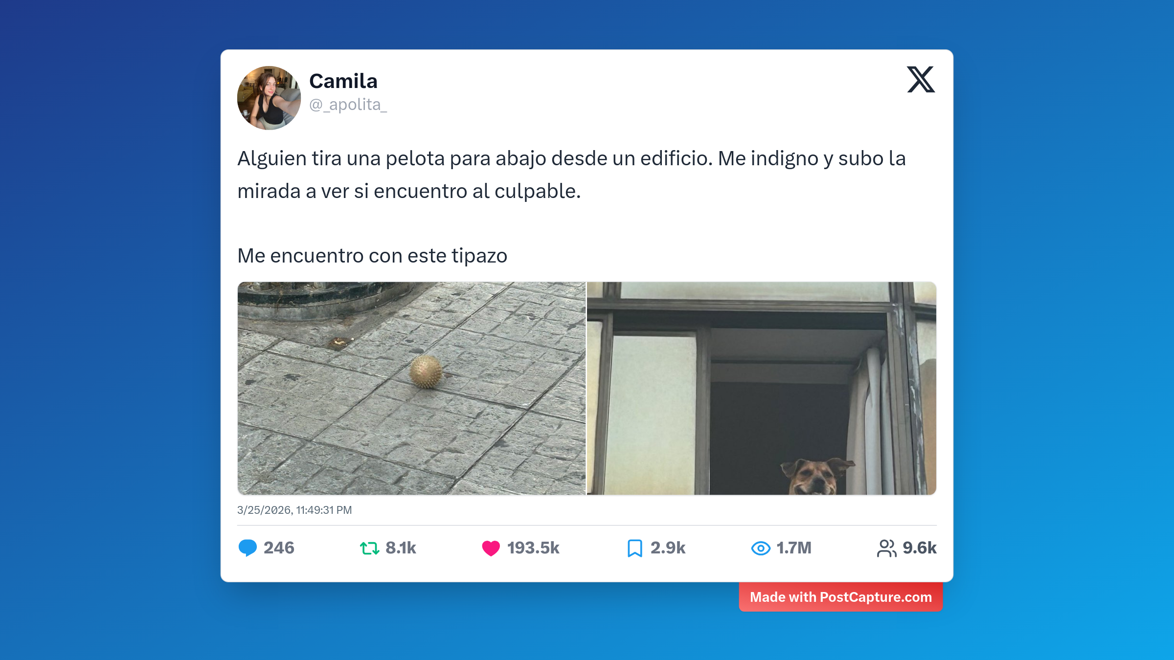 - * **Camila (@_apolita_)**: A veces, la indignación urbana termina en un encuentro inesperado (193.5K likes). Su relato sobre cómo bajó a reclamar por una pelota tirada desde un edificio para encontrarse con un tipo increíble se volvió la sensación de la semana. Un giro de guion que solo Twitter puede ofrecer.