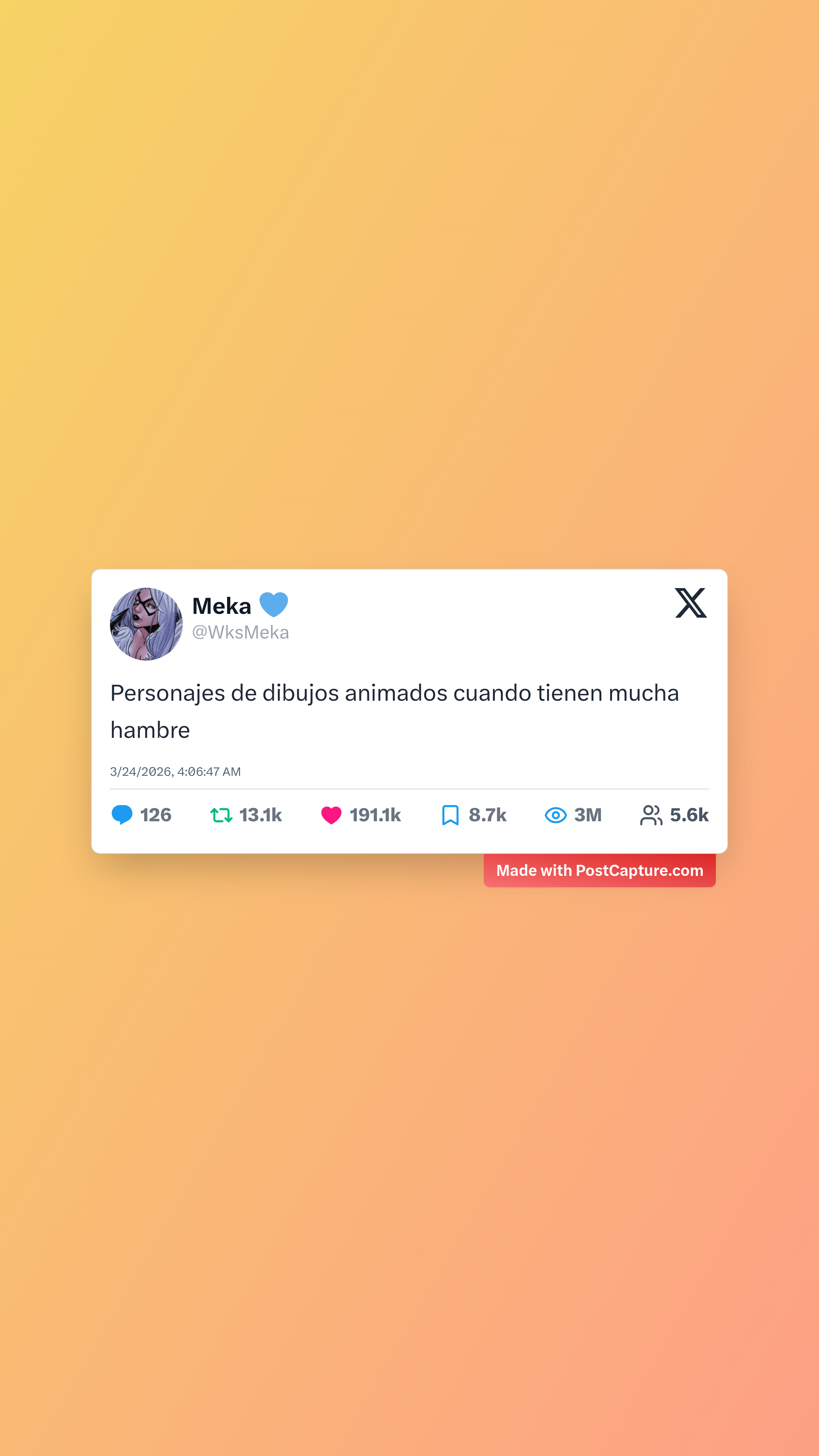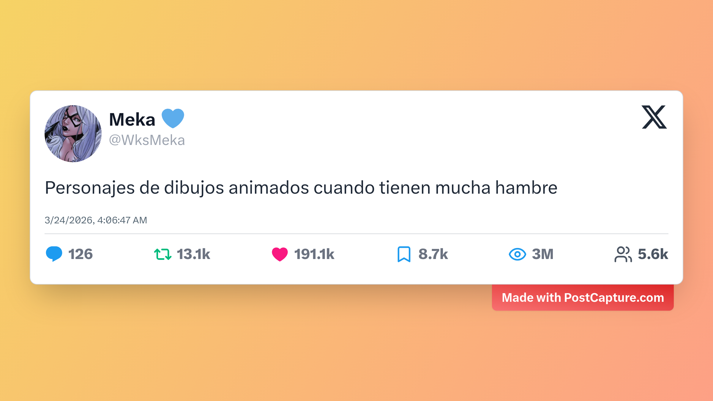 - * **Meka (@WksMeka)**: La física de los dibujos animados nunca falla (191K likes). Meka comparó una imagen real con la apariencia de los personajes de caricaturas cuando tienen mucha hambre, logrando que más de 190 mil personas se sintieran identificadas. A veces, la respuesta a la vida está en una hamburguesa mal formada.
