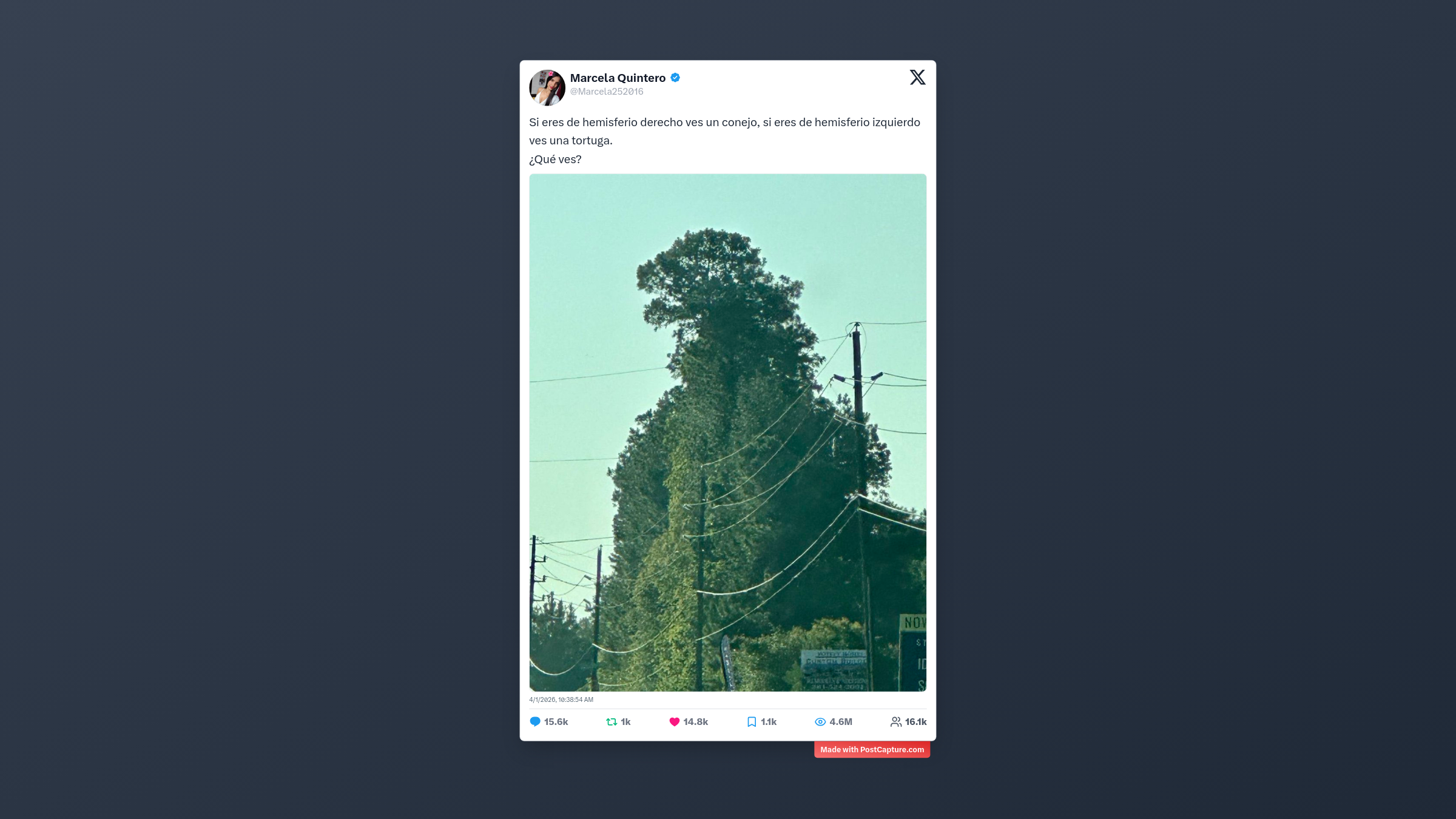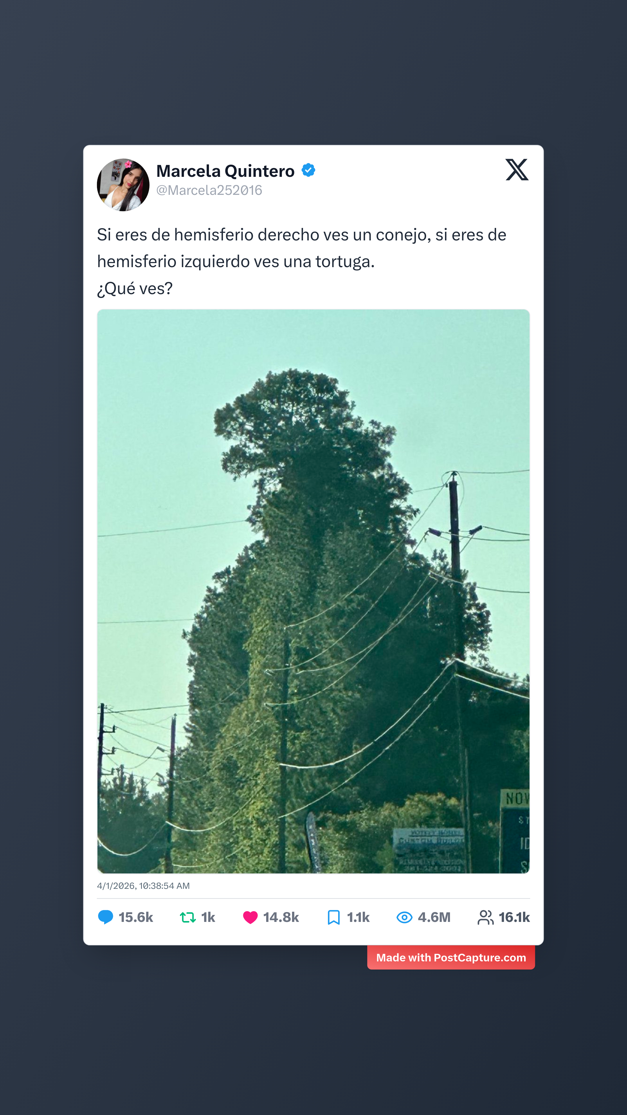 El post que encabezó las interacciones vino de la mano de Marcela Quintero (@Marcela252016). Con una ilusión óptica clásica, nos puso a prueba: ¿ves un conejo o una tortuga? La respuesta parece depender del hemisferio que predomine en tu cerebro. Con más de 15,500 respuestas, quedó claro que nada le gusta más a la comunidad que debatir sobre su propia percepción. ¿Y tú, qué viste primero?