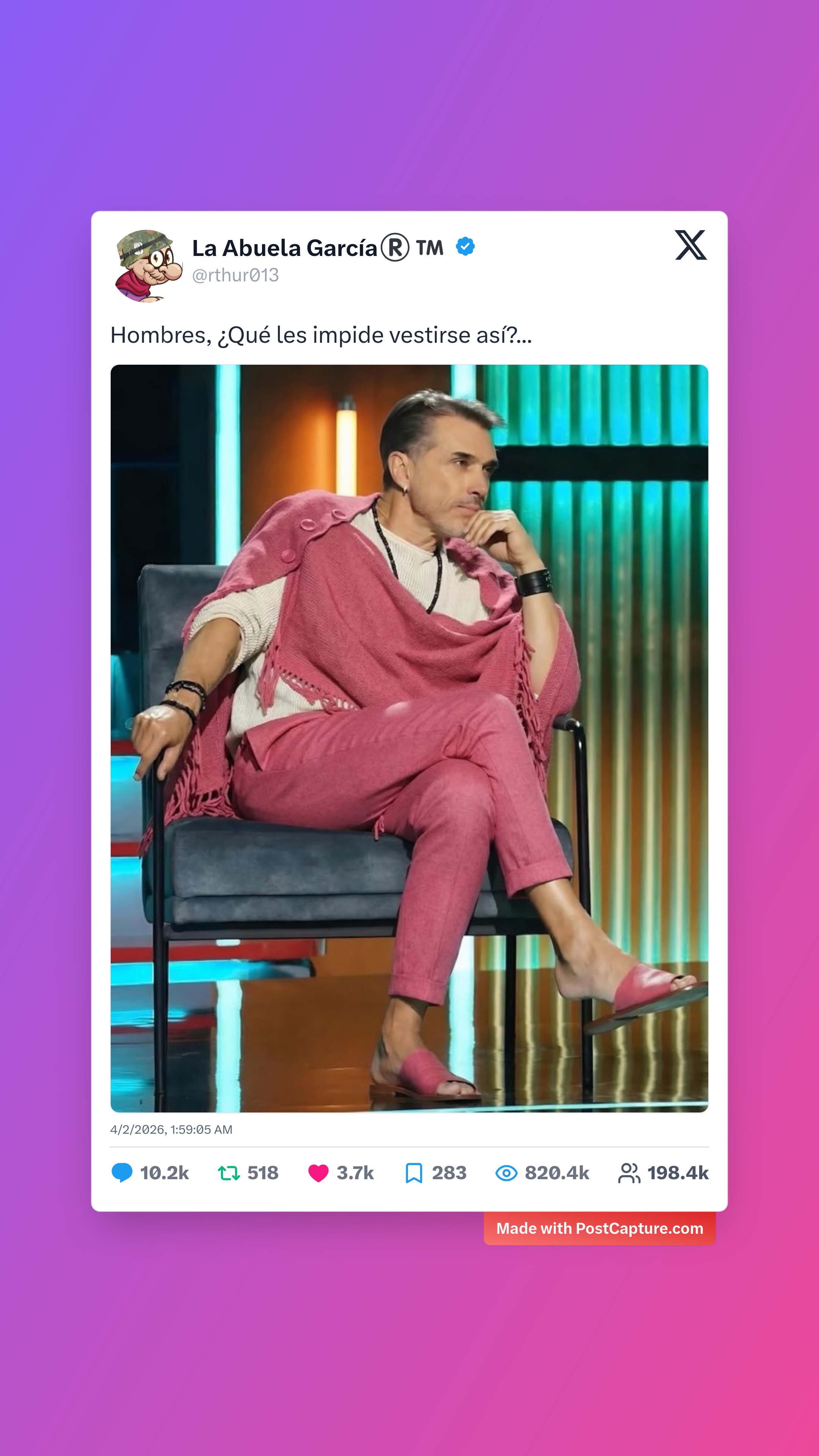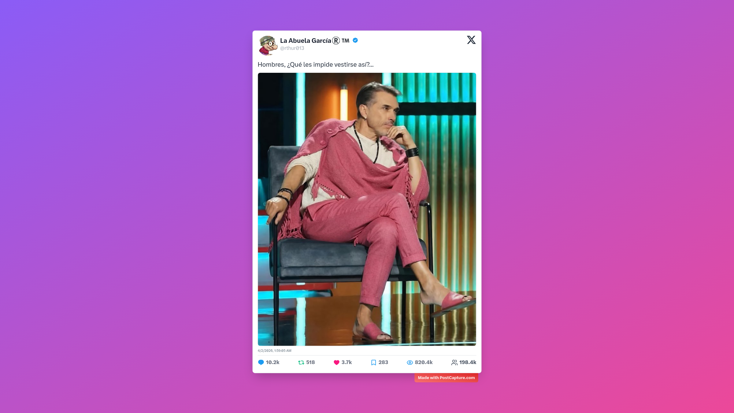 Por último, La Abuela García (@rthur013) le puso un toque de humor y estilo a la semana. Su pregunta 'Hombres, ¿Qué les impide vestirse así?' acompañada de una imagen llamativa, desató más de 10,200 respuestas. Entre memes, ironías y algunos que se tomaron la moda muy en serio, la cuenta demostró que, a veces, la clave para un engagement masivo es simplemente desafiar las normas establecidas con una pizca de ironía.