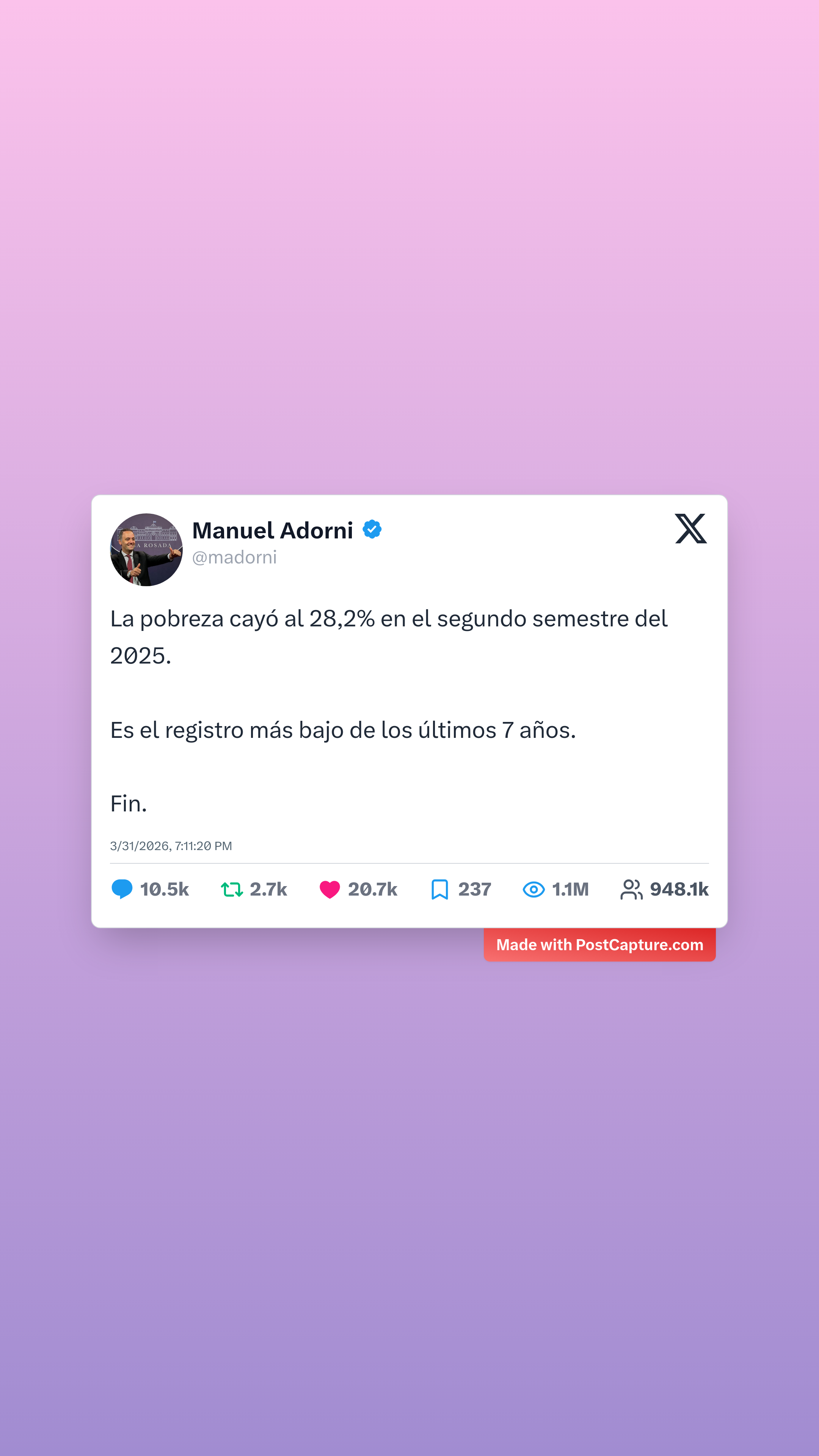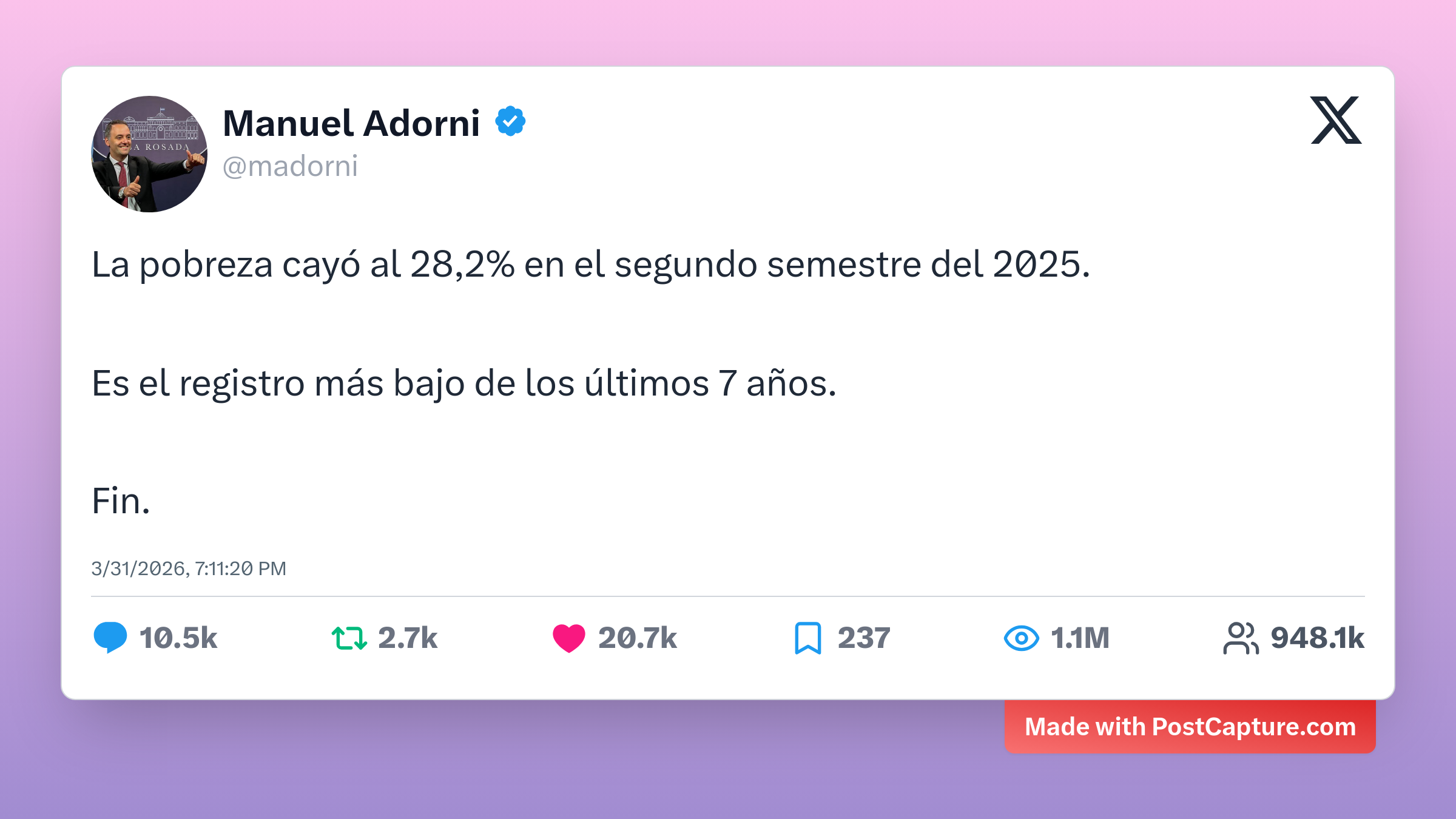 En un registro totalmente distinto, el Jefe de Gabinete argentino, Manuel Adorni (@madorni), generó gran revuelo con un anuncio económico: la caída de la pobreza al 28,2% durante el segundo semestre de 2025. Con más de 10,400 respuestas, el post se convirtió rápidamente en un campo de batalla para opiniones políticas encontradas, demostrando una vez más cómo se vive la actualidad argentina en las redes sociales.