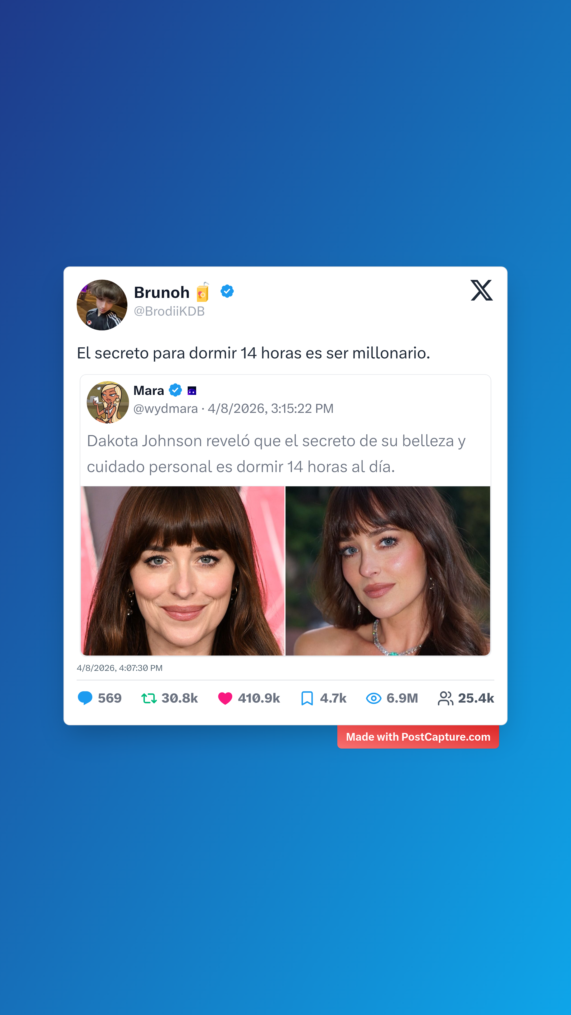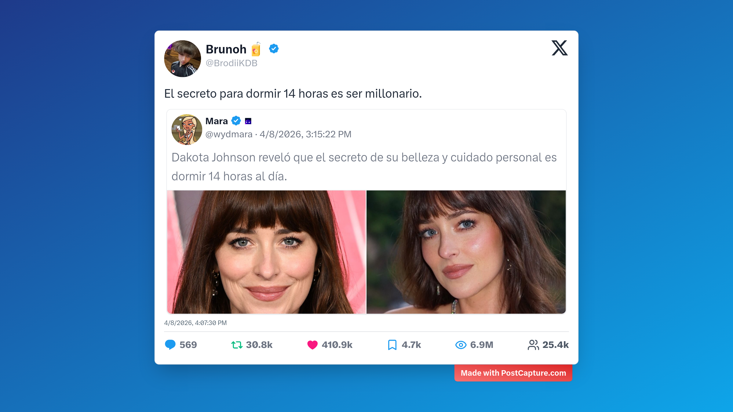 El ingenio fue la clave de la semana, especialmente con el post de Brunoh, que acumuló más de 410,000 likes al ironizar sobre el "secreto" de belleza de Dakota Johnson. Su comentario de que el verdadero secreto es simplemente tener una cuenta bancaria abultada resonó con miles de personas, demostrando que un poco de sarcasmo es la receta perfecta para hacerse viral.