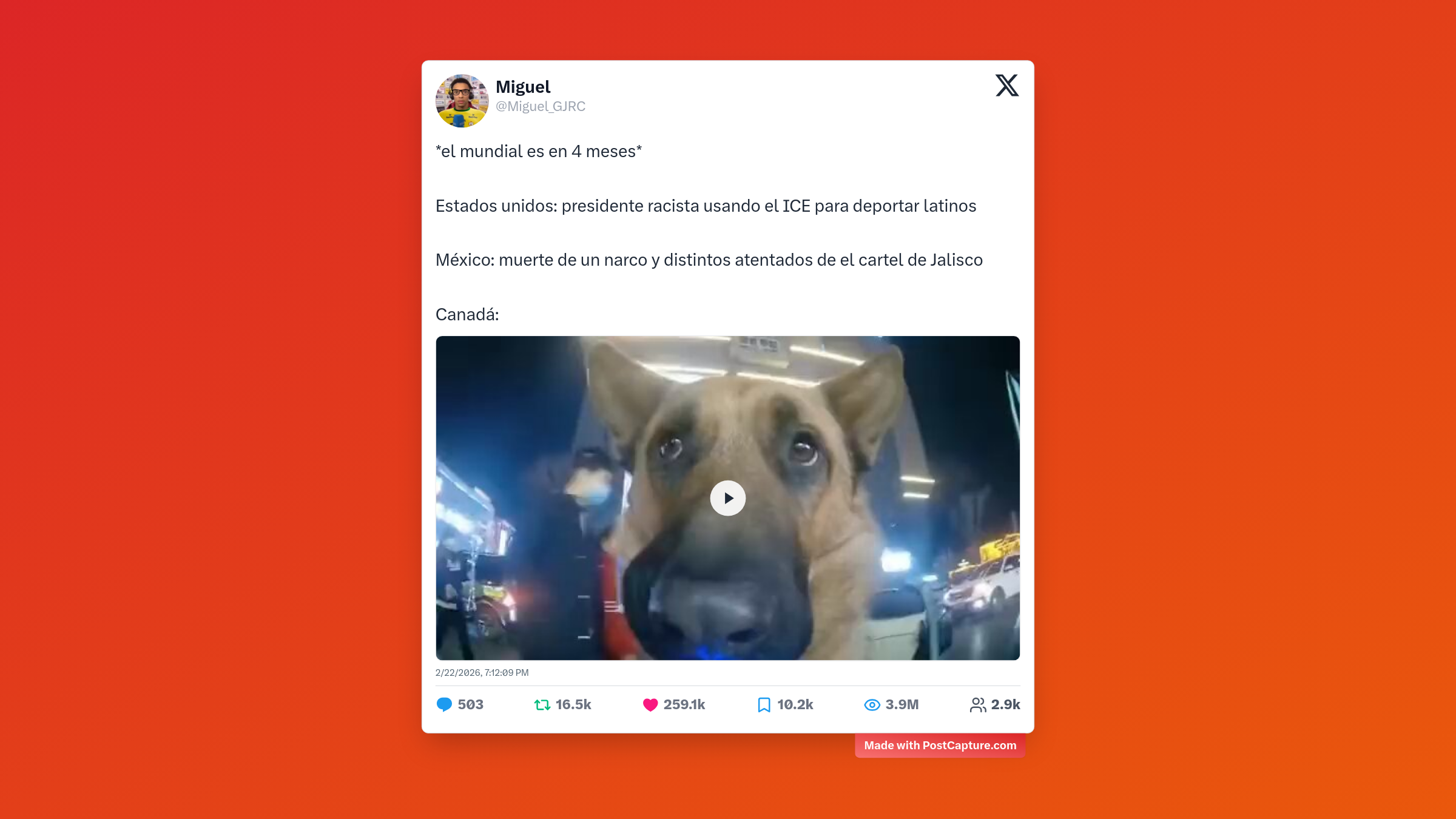 El rey de los likes esta semana es Miguel (@Miguel_GJRC), quien con un timing perfecto nos recuerda que el Mundial está a solo cuatro meses y el panorama no pinta nada bien. Imagina: Estados Unidos con un presidente racista deportando latinos vía ICE, México lidiando con la muerte de un narco y atentados del Cártel de Jalisco, y Canadá... bueno, con algo tan canadiense que solo un video lo explica. Este tweet sumó más de 259 mil likes, 16 mil retweets y casi 3.9 millones de vistas. Los usuarios no pararon de comentar, algunos con preocupación genuina y otros agregando sus propios chistes sobre cómo el fútbol une al mundo, aunque sea en el caos. Es como si el post dijera: '¿Listos para el espectáculo? Porque el drama ya empezó'.