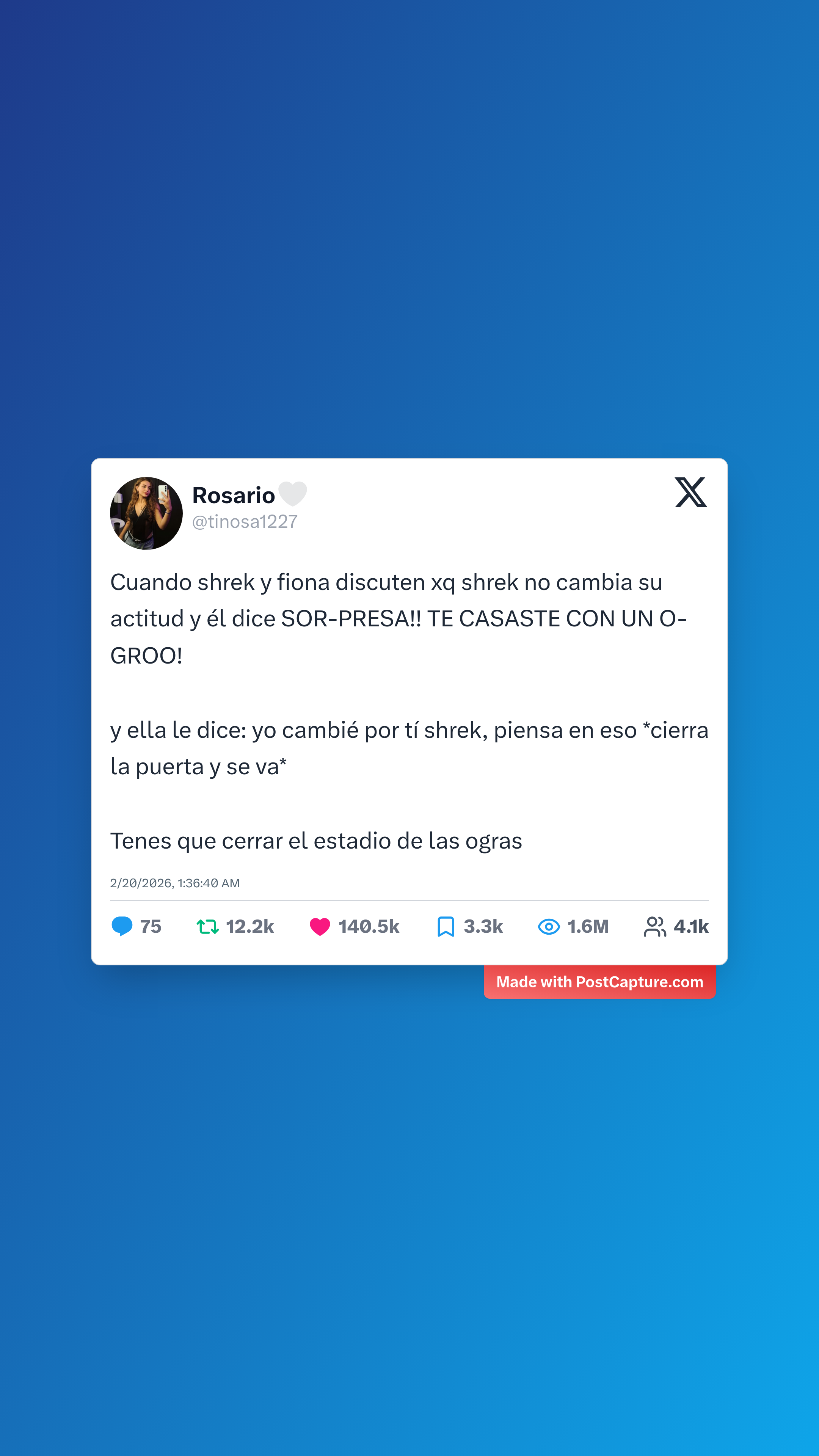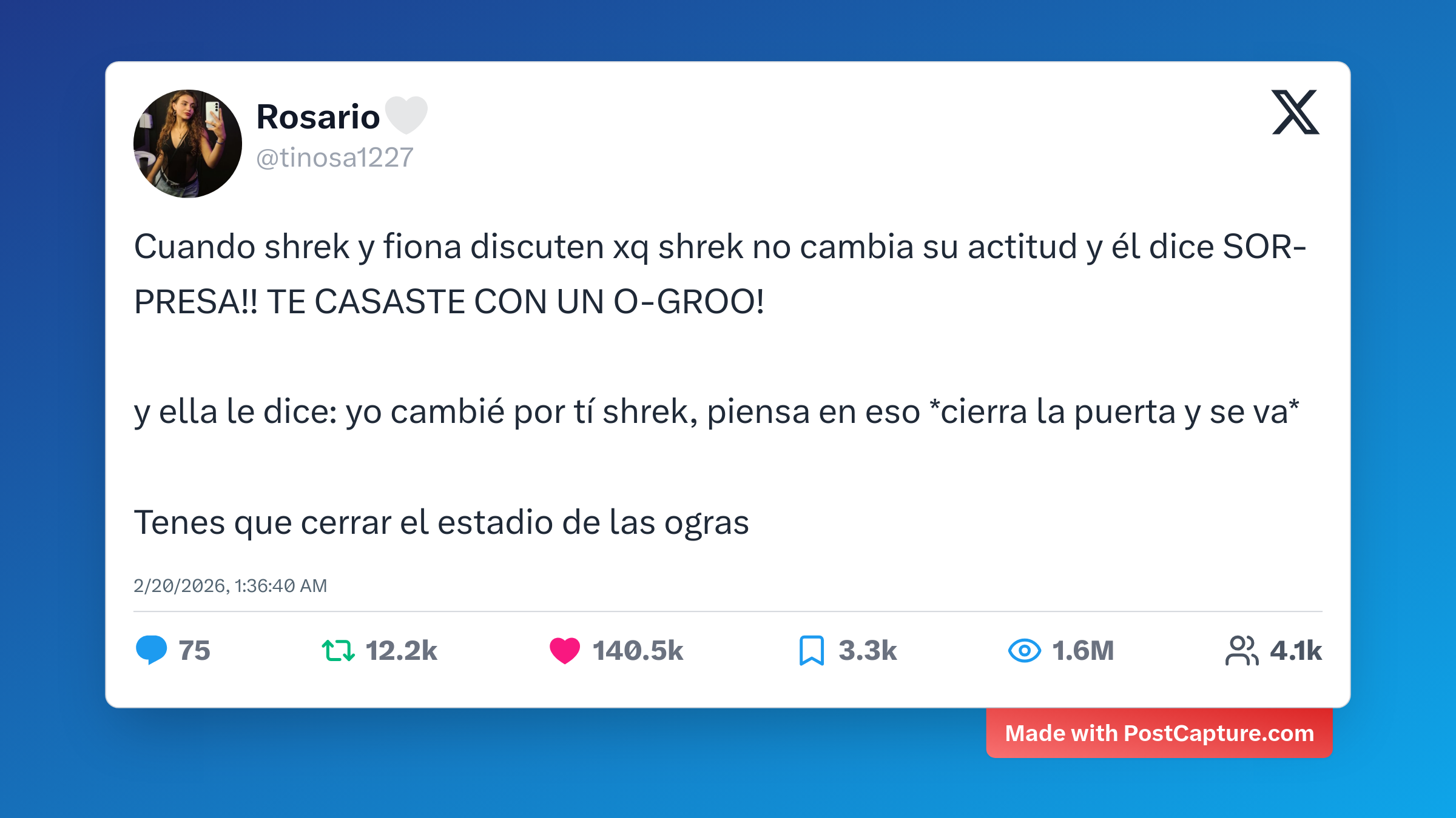 En segundo lugar, Rosario (@tinosa1227) nos regala una joya de nostalgia con un twist: esa escena icónica de Shrek donde él grita '¡SOR-PRESA! ¡TE CASASTE CON UN O-GROO!' y Fiona responde con un portazo épico, argumentando que ella cambió por él. El remate? 'Tenes que cerrar el estadio de las ogras'. Simple, directo y brutalmente relatable, este tweet acumuló 140 mil likes y 1.6 millones de vistas, con retweets que volaron como ogros en pantano. Es el tipo de contenido que te hace revivir la película mientras piensas en tus propias discusiones de pareja. ¿Quién no ha sentido que su relación es un cuento de hadas... con monstruos incluidos?