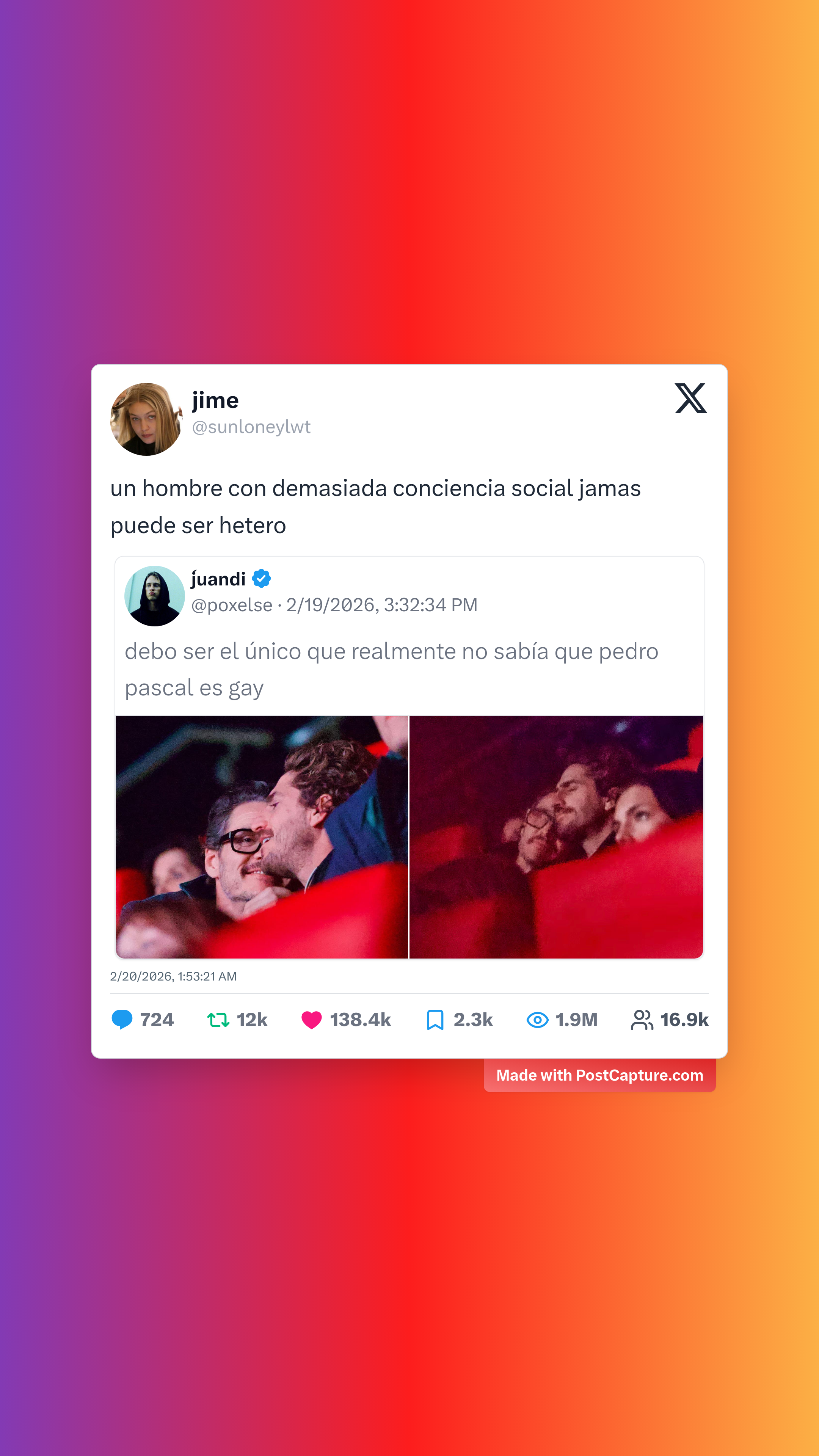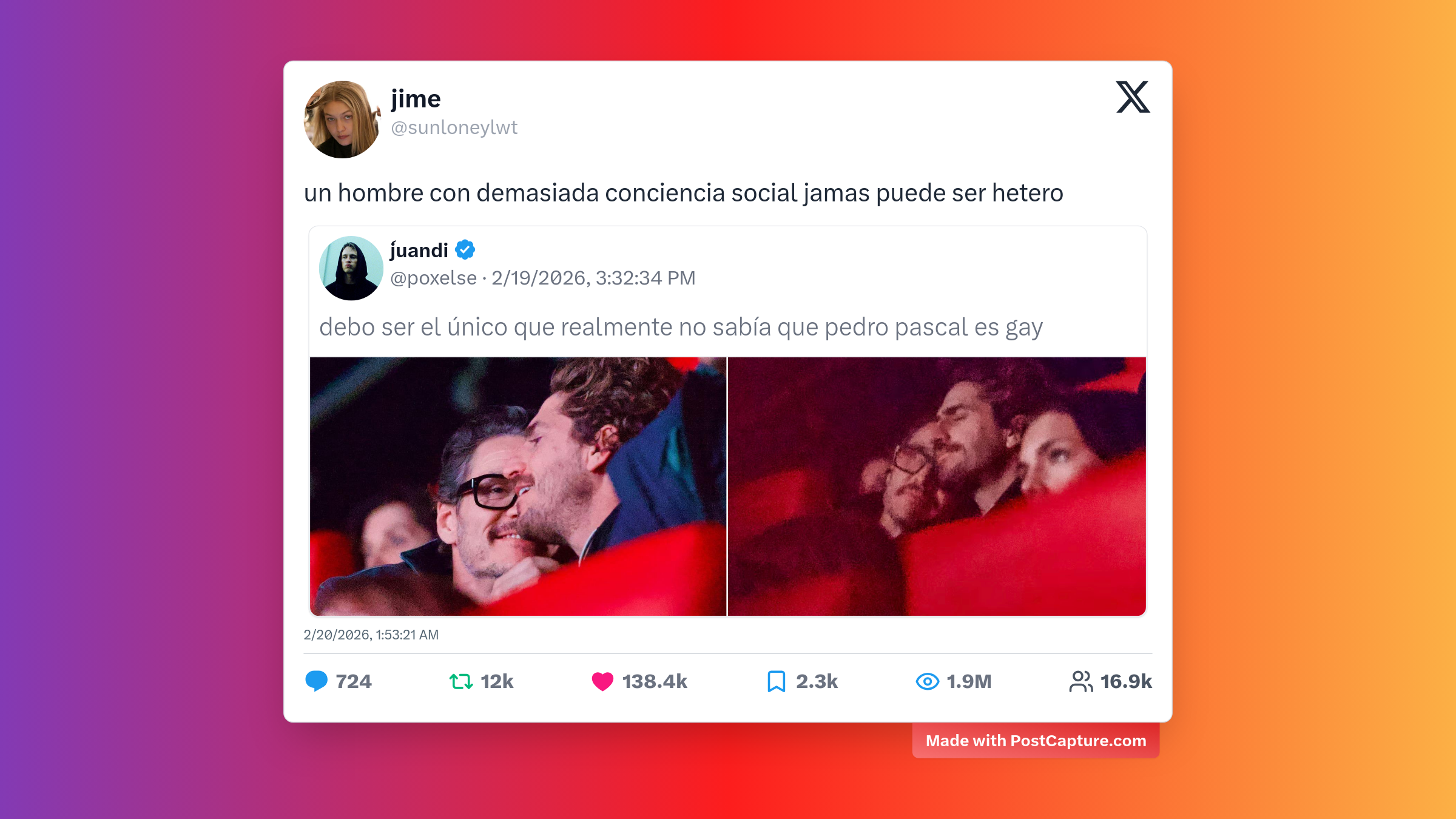 Cerramos con jime (@sunloneylwt), quien lanza una bomba de observación social: 'un hombre con demasiada conciencia social jamas puede ser hetero', citando un tweet sobre Pedro Pascal que sorprendió a más de uno. Con 138 mil likes y 1.9 millones de vistas, este post desató debates, risas y un montón de '¡exacto!' en los comentarios. Es una mezcla de humor queer y crítica ligera que resuena en tiempos de redes sociales hiperconectadas. Al final, estos tweets nos muestran que los likes no solo miden popularidad, sino también cómo conectamos con el absurdo de la vida cotidiana. ¿Cuál te dio más likes en tu mente? ¡Cuéntanos y sigamos sumando corazones!